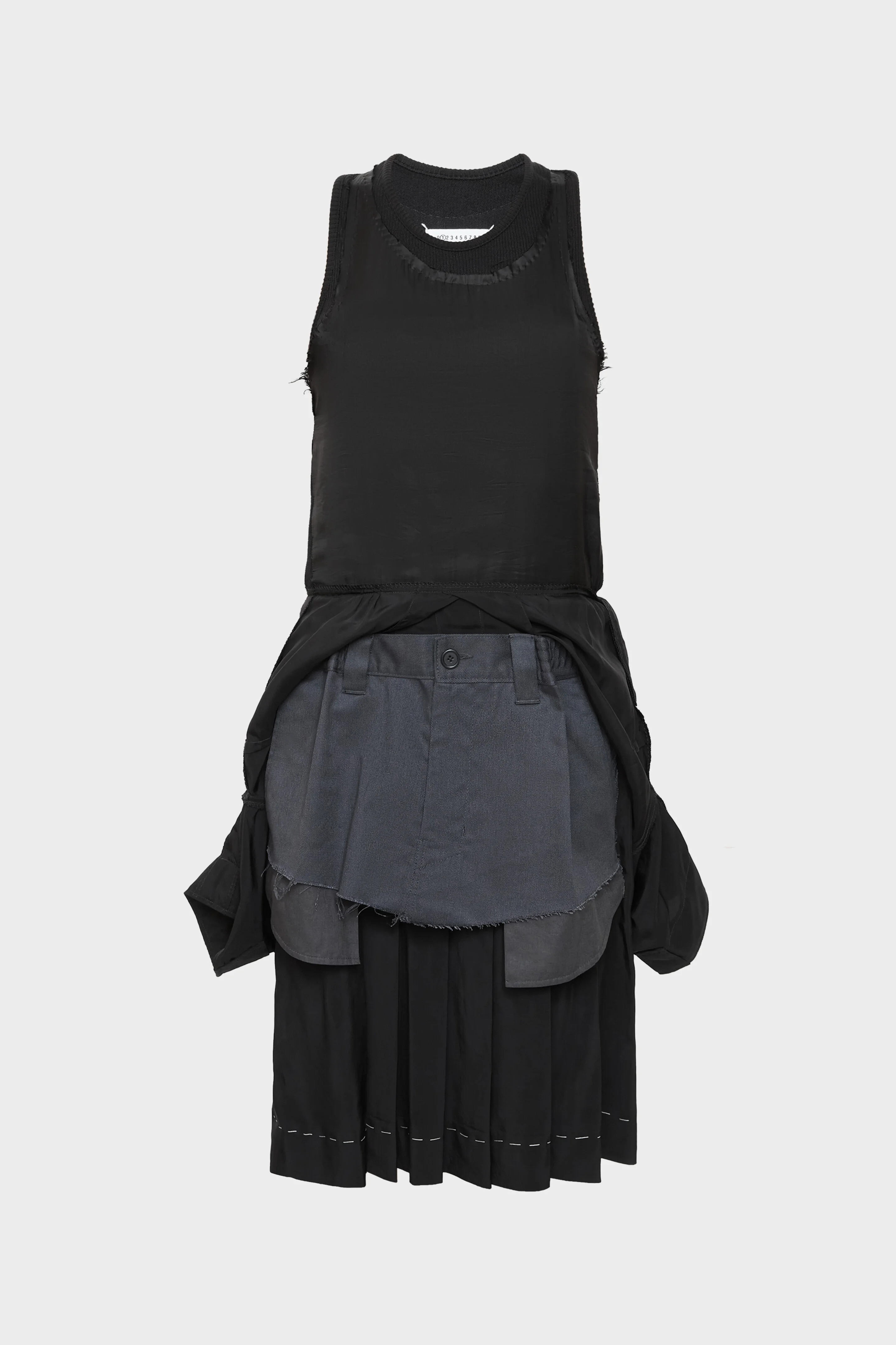 A true experimentation of the Maison's Anonymity of the lining technique, the viscose-cotton dress showcases revealed layers. The first skirt is cut at the knee with work-in-progress stitches around the hem, with a second layer slashed to reveal the pockets. The third layer, a reworked shirt, creates an exaggerated silhouette, while the top of the dress features a double layer scoop neckline. Maison Margiela's signature, the four stitches, appear at the back; the opposite of a label. Product Details Item ID S51DD0029MTN059900 Primary Fabric: 100% Viscose-Rayon Secondary Fabric: 100% Cotton Third Fabric: 100% Cupro Fourth Fabric: 60% Polyester 40% Cotton Pocket Lining: 100% Cotton Viscose cotton midi dress Scoop neck with ribbed trims Sleeveless Pleated skirt Decortique details Basting stitches Four stitches at the back Made in Italy Model is 178 cm tall and wears a size 40.