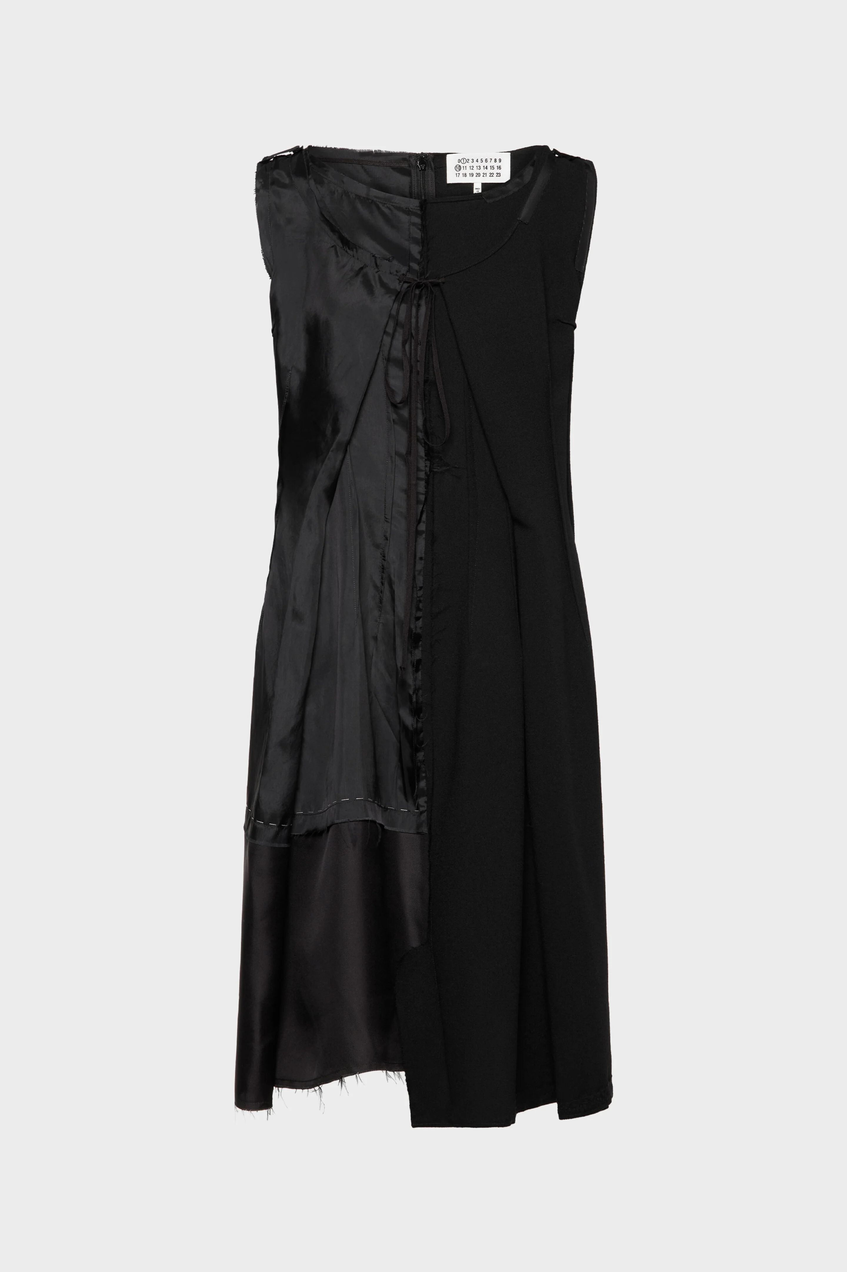 Structured wool meets fluid acetate-cupro in the Maison's reinvention of the little black dress. A ribbon tie fastens the lining to the outer layer, revealing reversed darts and raw seams. Through Anonymity of the Lining, what’s usually hidden becomes the focal point. Maison Margiela’s signature, the four stitches, appear at the back; the opposite of a label. Product Details Item ID S51DD0042MTN092900 Primary fabric: 100% virgin wool Secondary fabric: 60% acetate, 40% cupro Tertiary fabric: 100% silk Sleeveless dress with layered construction Wool front panel offset by fluid cupro drape Drawstring detail at the chest joins both layers Visible darts and basting stitch lines Raw edges and irregular hem Four stitches at the back Made in Italy