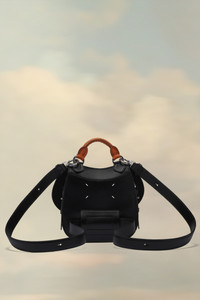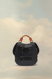 This curved leather bag is crafted from leather with a contrast woven top handle and long tonal straps offering multiple ways to wear, from a backpack to a cross-over design. It follows a curved shape with stitching details and opens with a popper and decorative buckle at the front, revealing a zipped inner section, one main pocket and the Maison Margiela logo. Product Details Item ID SI4WG0002P4931T8013