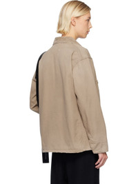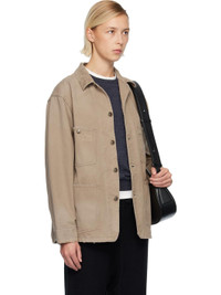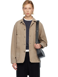 Cotton herringbone jacket. · Subtle distressing throughout · Corduroy trim at spread collar · Button closure · Patch pockets at front · Dropped shoulders · Button fastening at cuffs · White stitching at back collar · Full twill lining · Antiqued bronze-tone hardware Supplier color: Stone washed beige Body: 100% cotton. Lining: 65% polyester, 35% cotton. Made in Italy 252168F063002