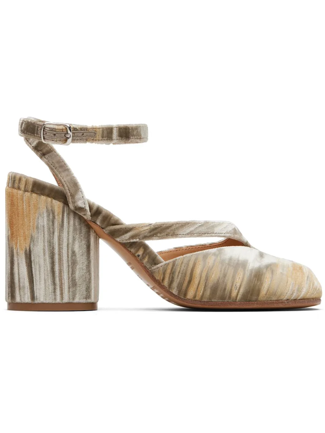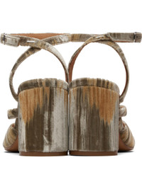 Velvet heeled sandals. · Jacquard graphic pattern throughout · Square cleft toe · Cutout at vamp · Wraparound pin-buckle ankle strap · White stitching at ankle strap · Buffed sheepskin lining · Covered block heel with rubber injection · Calfskin sole · Heel: H3" Supplier color: Brown Upper: textile. Sole: calfskin. Made in Italy 252168F125000