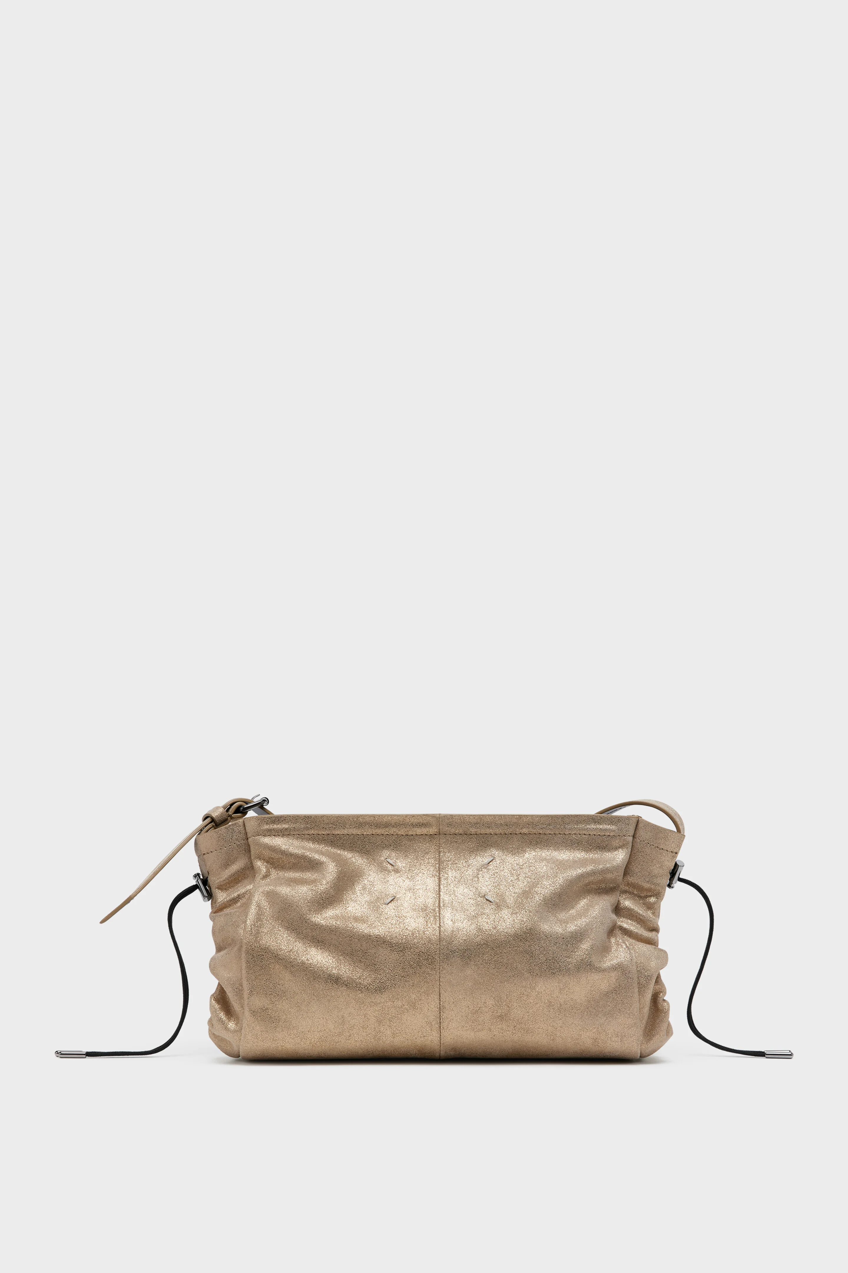 Crafted in soft suede with a metallic laminated foil finish, this horizontal shoulder bag features a zip closure and adjustable drawstring edges for a gathered finish. At the front, the Maison’s signature four stitches appear; the opposite of a label. Product Details Item ID SB1ZH0004P7453HB330 Body: 100% calf leather Contrast: 100% calf leather Inside: 100% calf leather Lining: 50% polyamide-nylon 50% polyurethane Accessories: 100% polyester Hardware: 100% brass Hardware: 100% zama Adjustable shoulder strap Drawstring side details Zip closure at the top Four stitches at the back Inside logo stamping Made in Italy