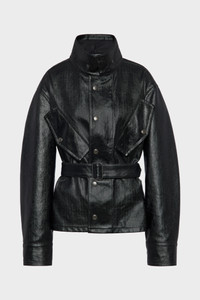 Structured in laminated cotton, this jacket plays with light and form. The coated surface enhances its utilitarian cut – complete with flap pockets, snap fastenings, and a cinched waist – while movement reveals a tactile herringbone texture beneath the sheen. Maison Margiela’s signature, the four stitches, appear at the back; the opposite of a label. Product Details Item ID S51AM0504M35599900 Fabric: 100% cotton Coating: 100% polyurethane Secondary fabric: 100% cotton Pocket lining: 100% cotton Coated cotton jacket with glossy finish Snap button closure at the front Flap pockets with press studs at the chest Adjustable belt at the waist with buckle Four stitches at the back Made in Italy