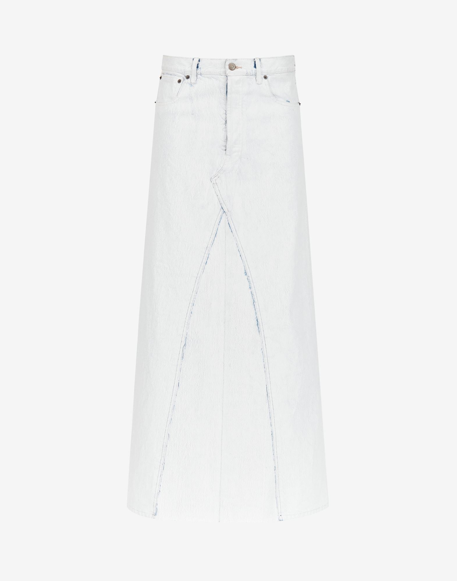 Long denim skirt with five pockets and raw edge details creating a trompe l'oeil effect of shelled, spliced jeans. It features the Bianchetto handmade technique with crackle effect, which intentionally evolves with wear. The Maison's four-stitches moniker adorns the back. Made in Italy. Item details 100% Cotton Denim Coated effect Button closing Five pockets High rear slit Unlined