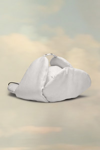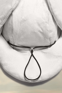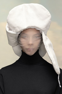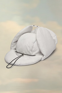 An oversized denim hat, with snap-button details, featuring the Maison's Bianchetto treatment which wears with age for an evolving look. The model is 179cm tall.