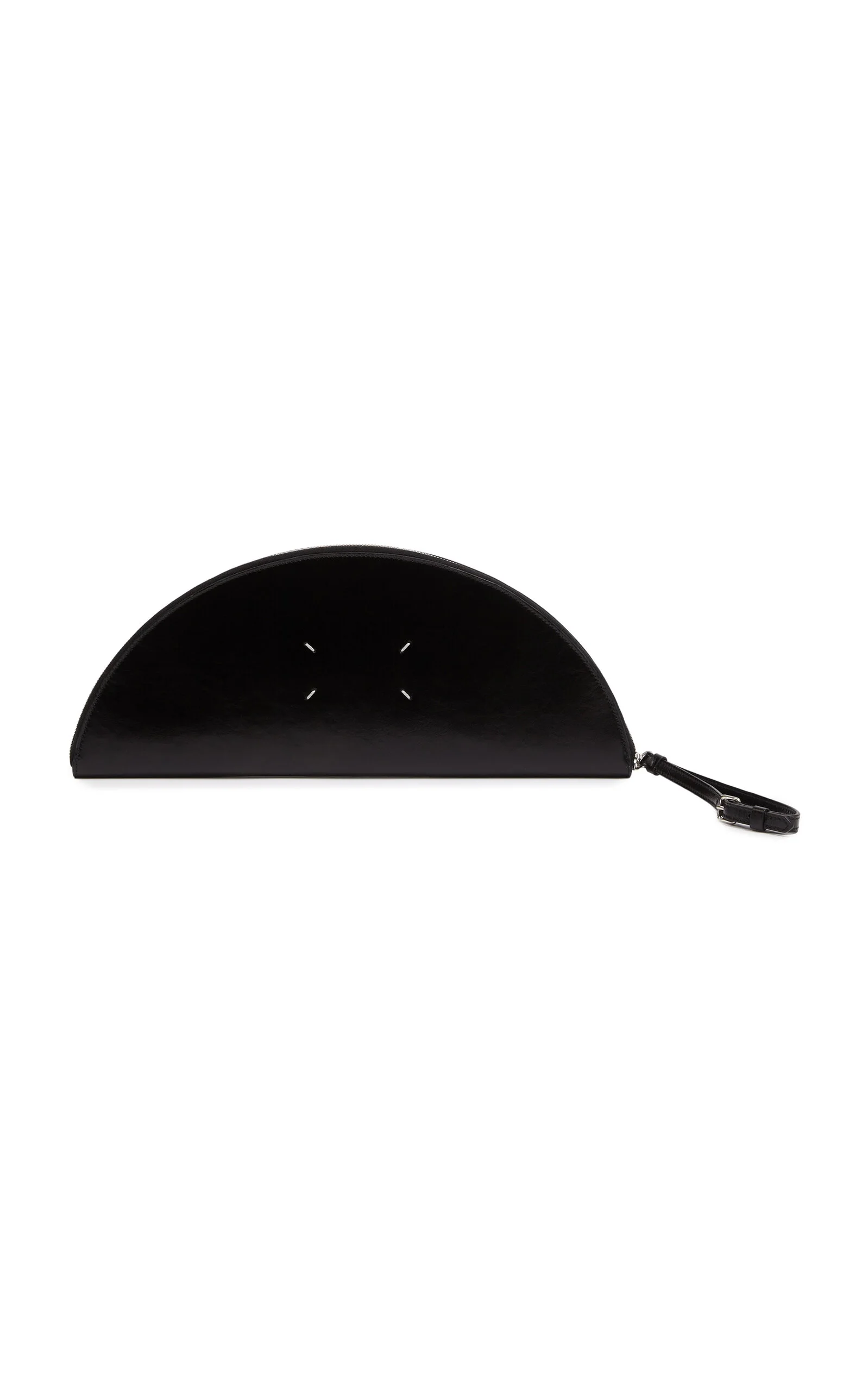 Radical conceptual designer Martin Margiela founded his eponymous couture house in 1988 and quickly established himself at the forefront of the Belgian fashion avant-garde. A half-moon pouch in a wrinkled glossy leather. The mini bag features a metallic zipped main compartment, adjustable wrist strap and is finished with the Maison’s signature, the four stitches; the opposite of a label. PRODUCT DETAILS - Zip fastening - Composition: 100% calf leather; Inside: 50% nylon, 50% polyurethane; Hardware: 100% brass; Hardware 2: 100% zama - Made in Italy