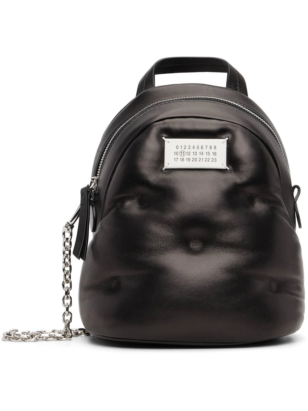 Padded grained sheepskin backpack. · Rolled carry handle · Adjustable and detachable crossbody strap · Logo patch at face · Patch pocket and D-ring at back face · Zip closure · Patch pocket at interior · Taffeta lining · H9" x W8" x D4.75" Supplier color: Black Sheepskin. Made in Italy 261168F042000