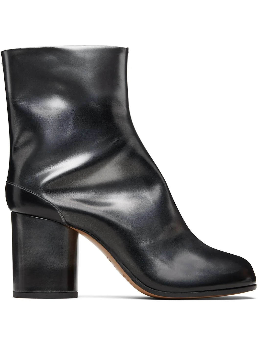 Ankle-high polished leather boots. · Smudging throughout · Square cleft toe · Hook-eye closure at inner side · White stitching at heel collar · Buffed leather lining · Covered block heel with rubber injection · Leather sole · Heel: H3" Supplier color: Silver/Black Leather. Made in Italy 252168F113013
