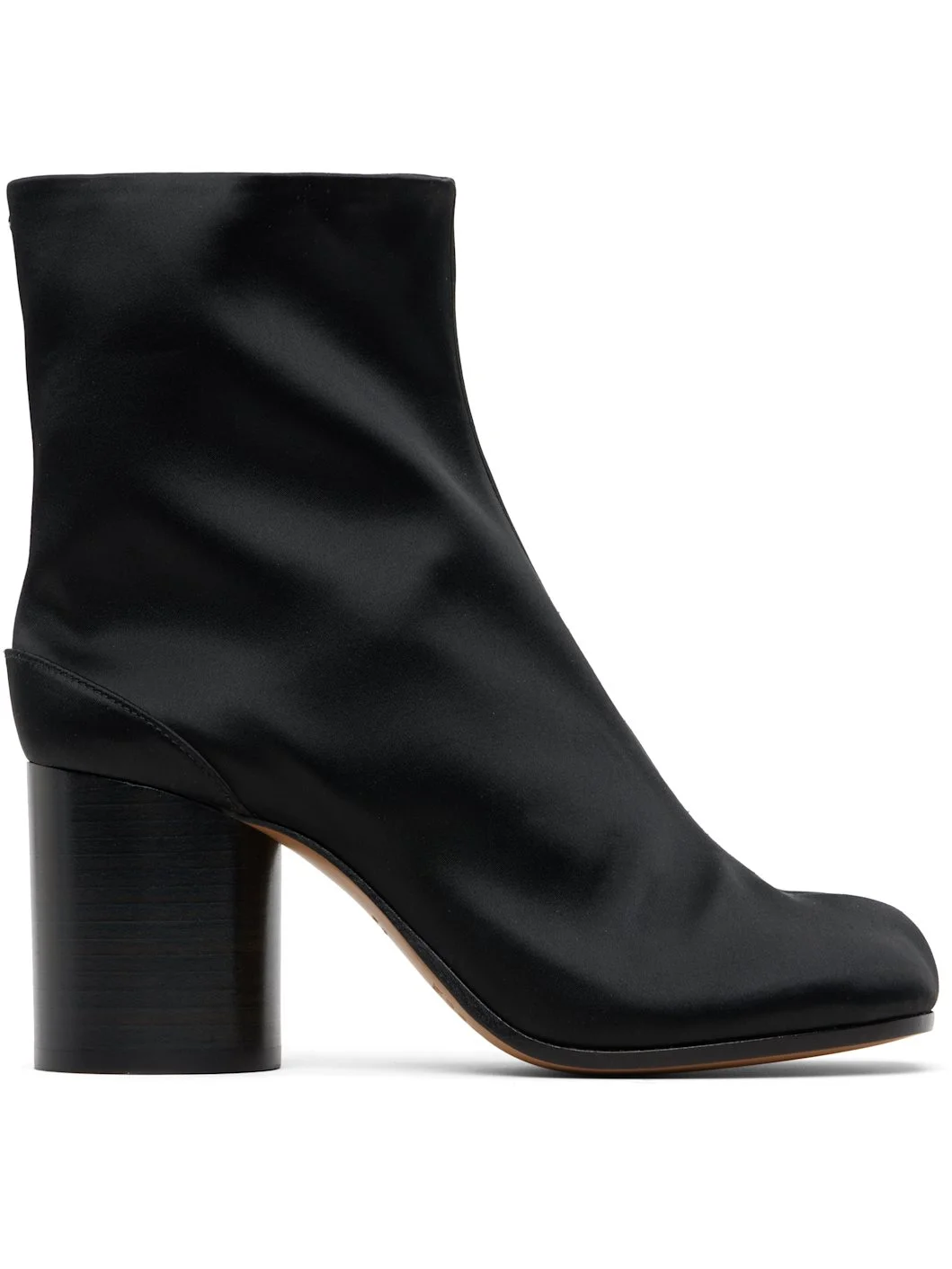 Ankle-high satin boots. · Tabi toe · Tab-slot closure at inner side · White stitch at heel collar · Stacked leather cylindrical heel with rubber injection · Polished leather sole · Heel: H3" Supplier color: Black Upper: textile. Sole: leather. Made in Italy 261168F113001