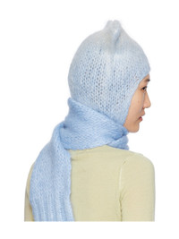 3-gauge hand-faded knit mohair-blend beanie in blue. · Extended scarf-style self-tie ear flaps · Rib knit trim at ear flaps · White stitching at back face Supplier color: Baby blue 80% mohair, 20% polyamide. Made in Romania 241168F014003