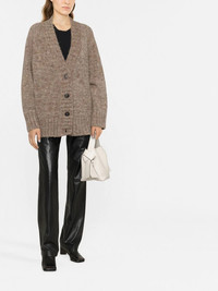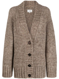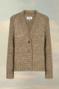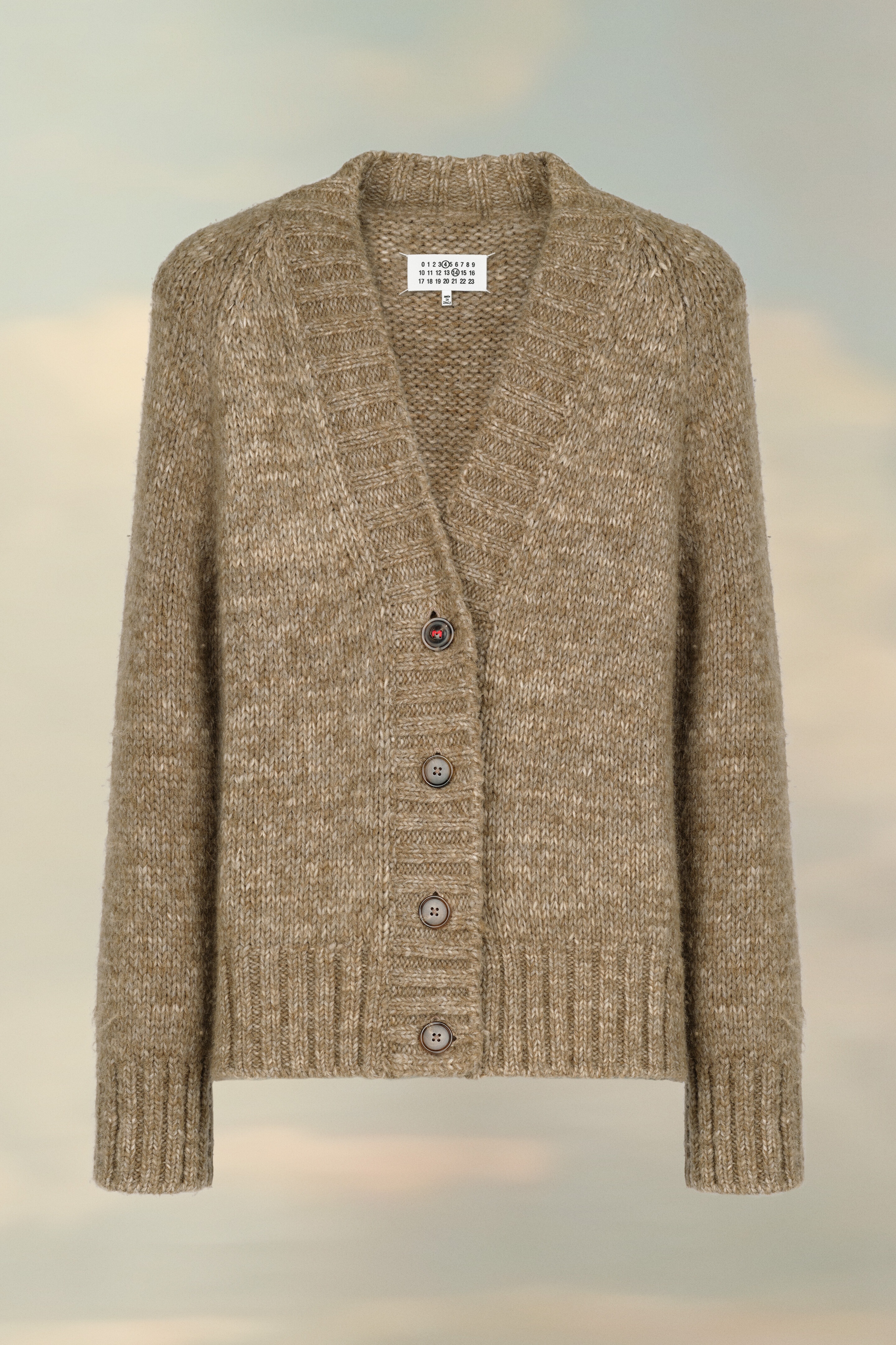 This V-neck knit cardigan with botanical dye features ribbed trims and the M button. At the back, four white stitches show the hand of the Maison: the opposite of a label. Gauge 3. Product Details Item ID SI0GP0004S17802741M Composition: 42% Alpaca, 30% Cotton, 28% Wool Cardigan Horn button closure with red M embroidery Ribbed trims Four stitches at the back Gauge 3 Made in Italy The model is 5'10" tall and wears size S.