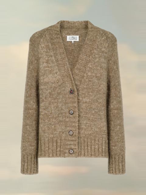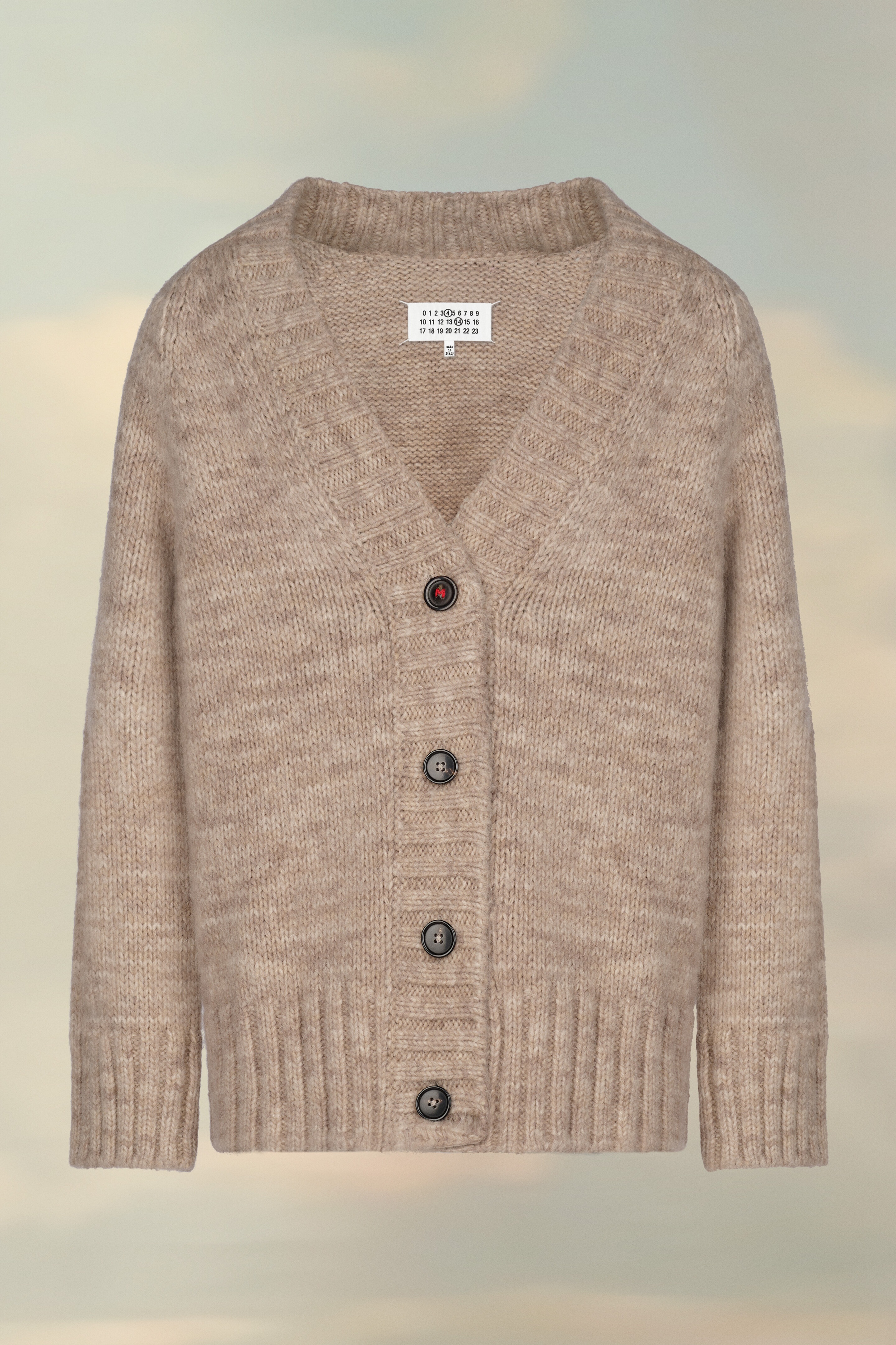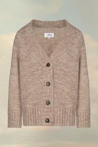 This V-neck knit cardigan with botanical dye features ribbed trims and the M button. At the back, four white stitches show the hand of the Maison: the opposite of a label. Gauge 3. Product Details Item ID SI0GP0004S17802119M Composition: 42% Alpaca, 30% Cotton, 28% Wool Cardigan Horn button closure with red M embroidery Ribbed trims Four stitches at the back Gauge 3 Made in Italy