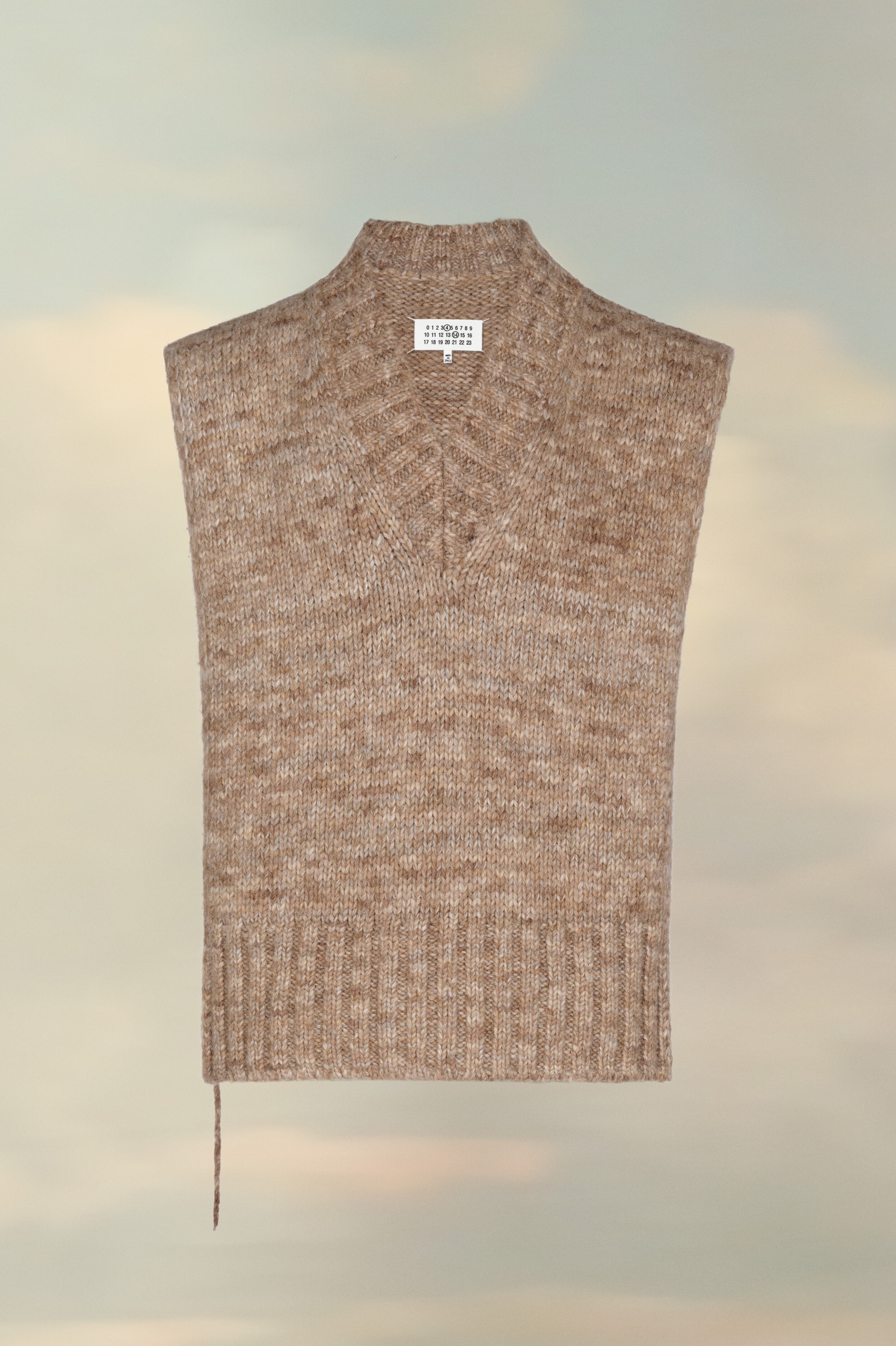 This oversized knit vest uses botanical dye, with loose threads and ribbed detail to the V-neck and hem. At the back, four white stitches show the hand of the Maison: the opposite of a label. Gauge 3. Product Details Item ID SI0TH0001S17802741M Composition: 42% Alpaca, 30% Cotton, 28% Wool V-neck vest Ribbed trims Four stitches at the back Gauge 3 Made in Italy