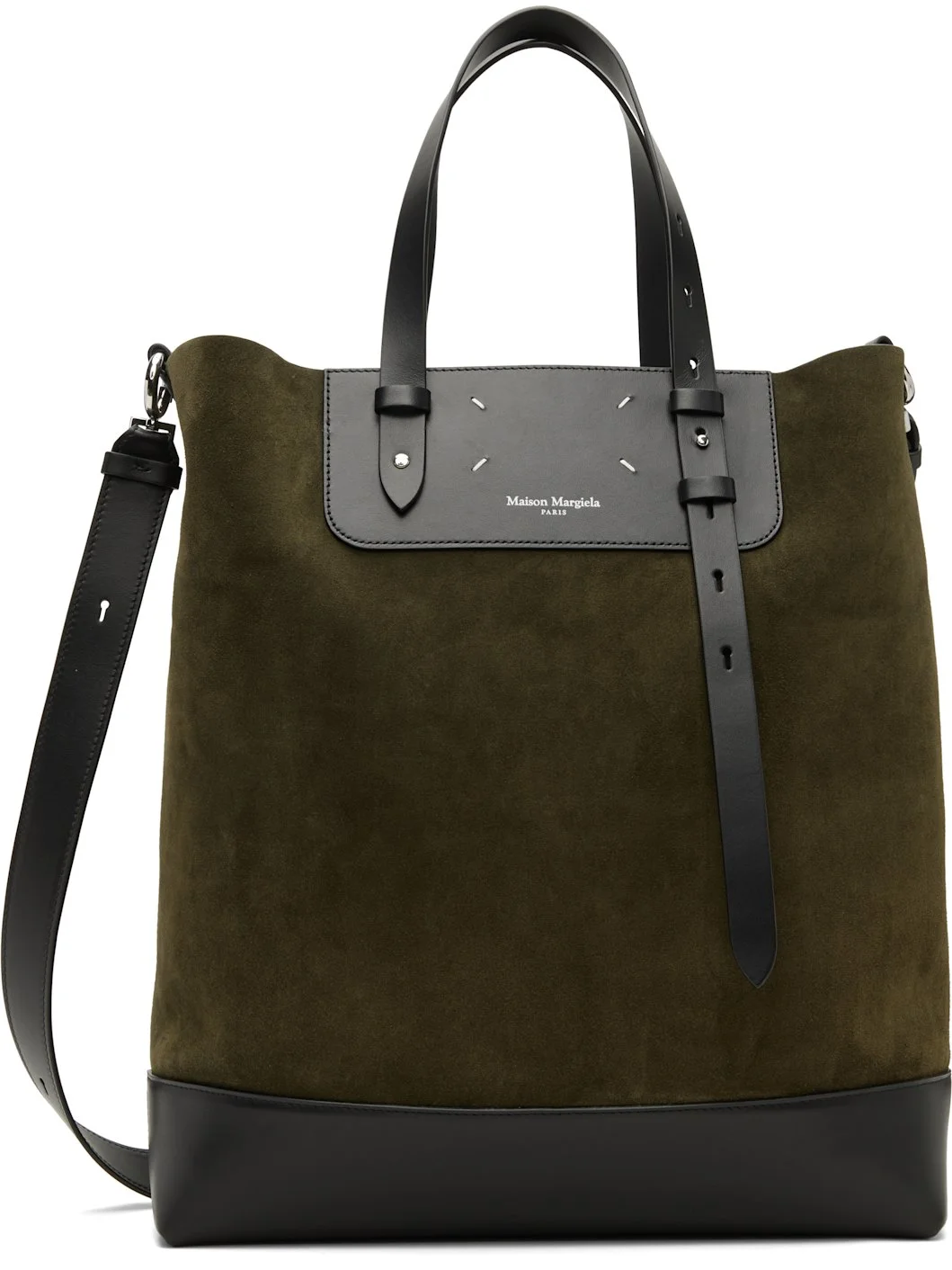 Calfskin suede tote. · Grained leather trim and base · Adjustable carry handles · Adjustable and detachable crossbody strap · D-ring at face · Stitching and logo stamp at back face · Suede interior · H16" x W17" x D5" Supplier color: Khaki/Black Calfskin. Made in Italy 252168F049000