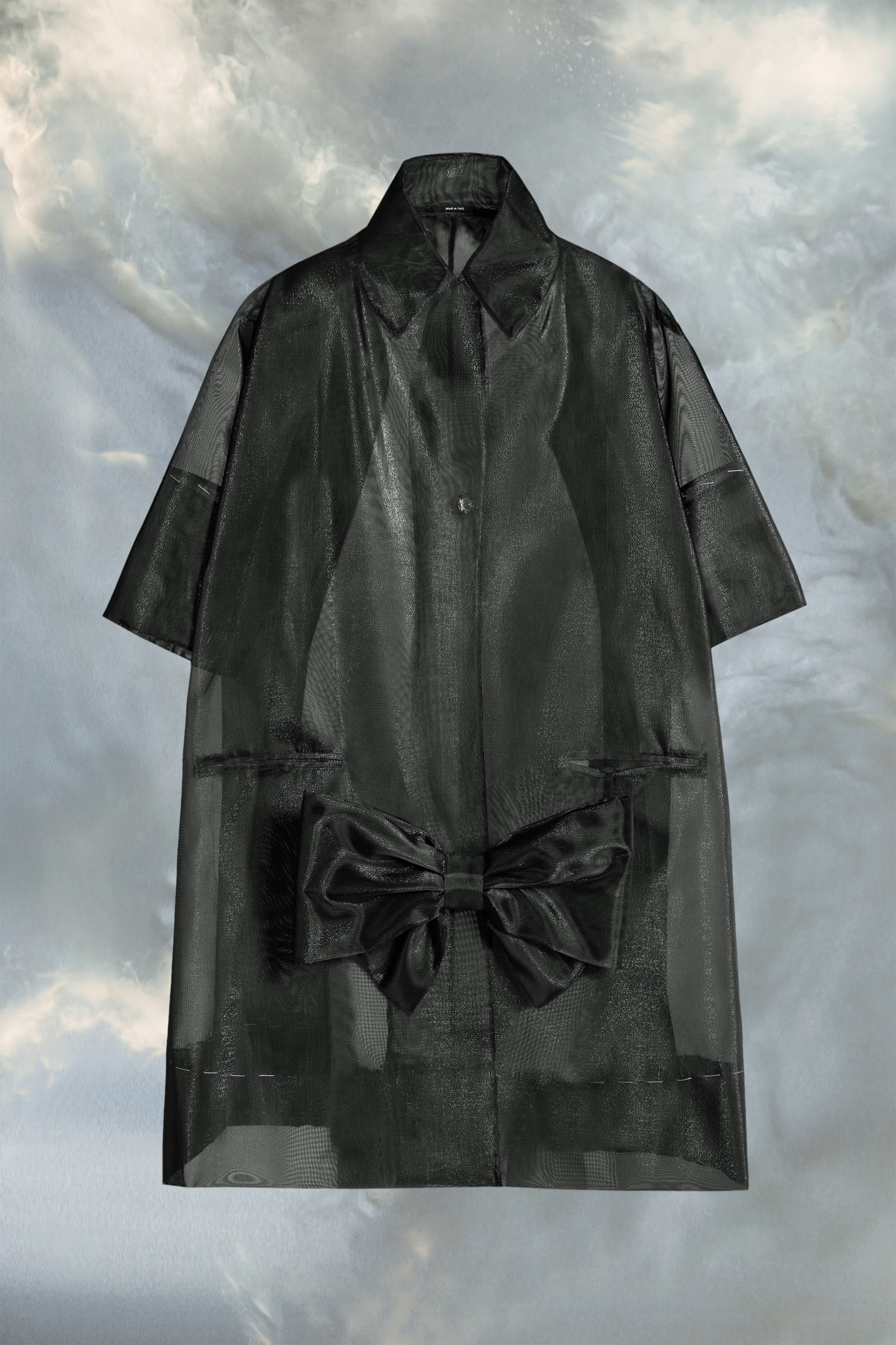 With a large front bow, the oversized caban coat is created from layered crinoline for sheer and semi-sheer sections. It has dropped shoulders and a press stud button closure, with flat pockets at the front. It demonstrates the Maison's Work-in-progress basting stitch technique around the hem and sleeves. Maison Margiela’s signature, the Four stitches, appear at the back; the opposite of a label. Product Details Item ID S29AM0393S78011900 COED Fall Winter 2023 Composition: 85% Polyamide, 15% Polyester Crinoline kaban Exaggerated front bow Press stud button closure Dropped shoulder Front flat pockets Basting stitch Four stitches at the back Made in Italy Oversized fit Model is 5'10" tall and wears a size 40.