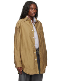 Oversized padded cotton satin shirt. · Spread collar · Button closure · Patch pocket · Shirttail hem · Seam pockets · Dropped shoulders · Pleat at single-button barrel cuffs · White stitching at back · Full satin lining · Mother-of-pearl hardware Supplier color: Camel Body: 100% cotton. Fill: 95% polyester, 5% nylon. Lining: 100% viscose. Made in Italy 242168F109003