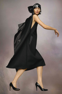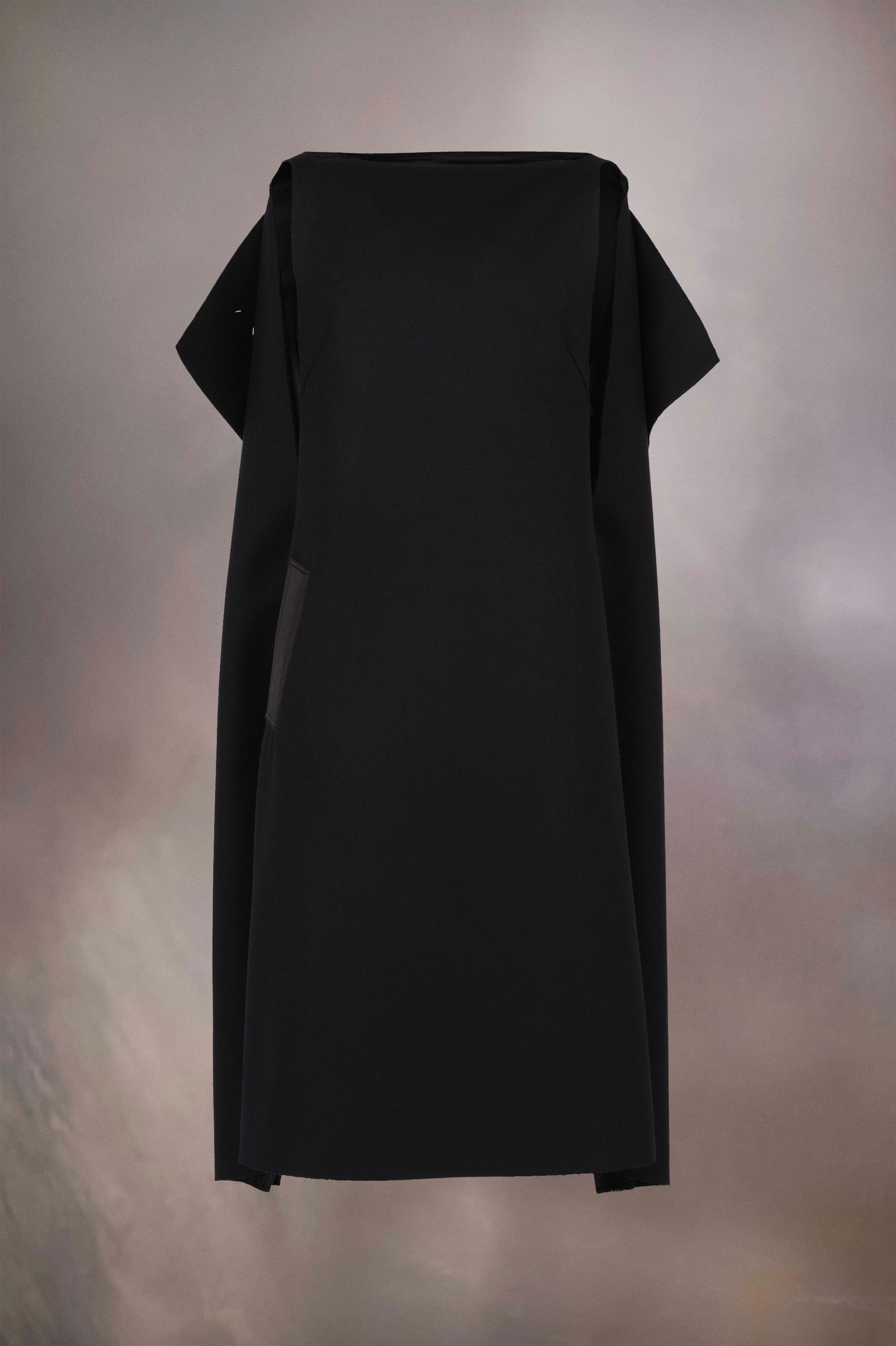 The below-the-knee cape dress in wool felt with a draped back panel features a waist tie to adjust the silhouette. A boat neckline is offset by an asymmetric pocket and shoulder straps. Maison Margiela's signature, the four white stitches, appear at the back; the opposite of a label. Product Details Item ID S51CU0317S44577900 Composition: 100% Wool Midi dress Boat neck Décortiqué lasered details Side gros grain pocket Draped opening at the back Back knot Four stitches at the back Made in Italy