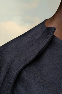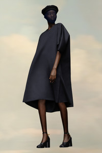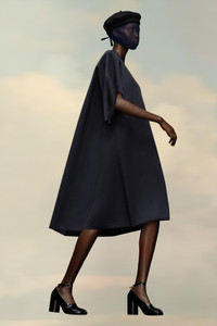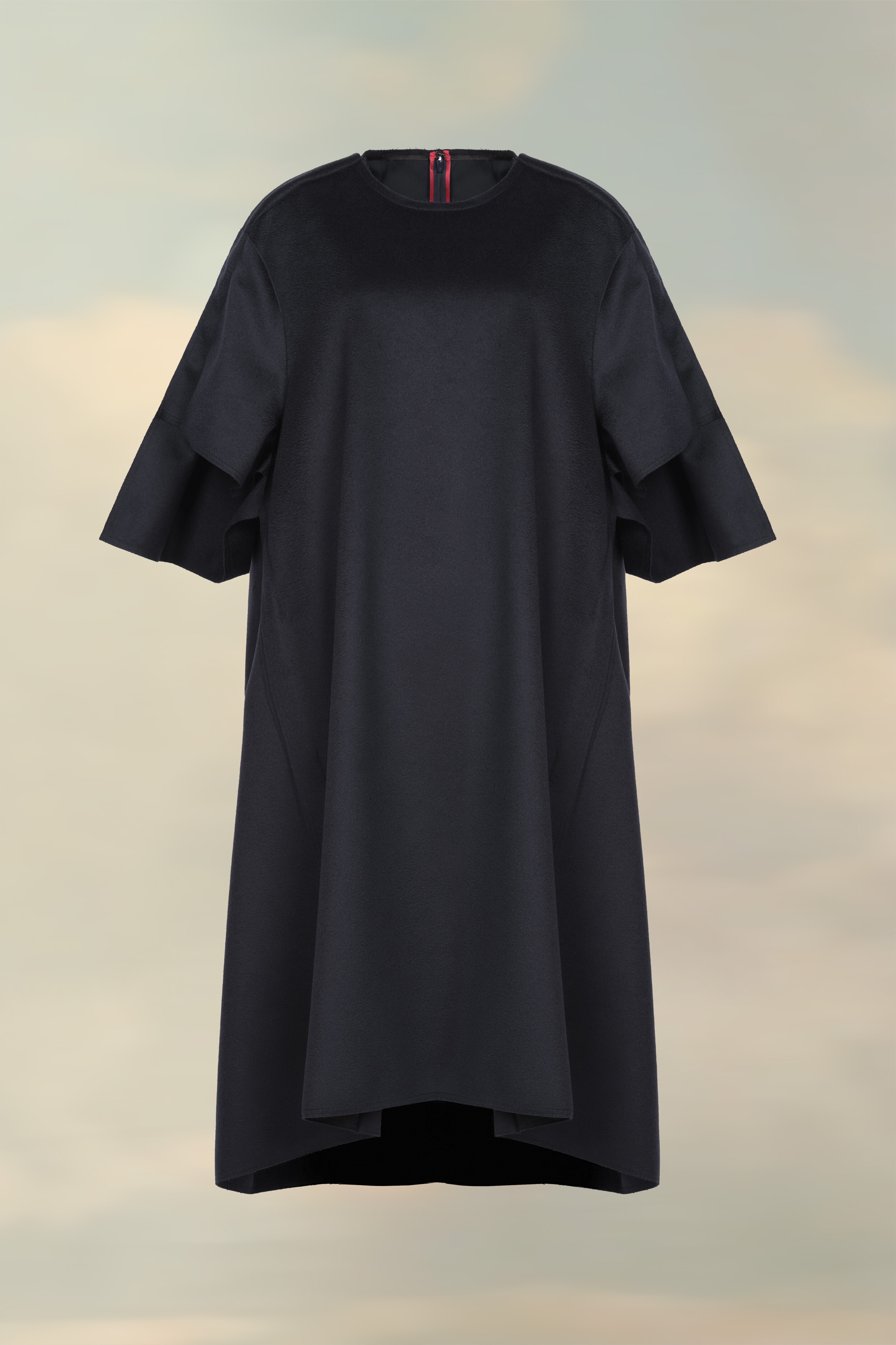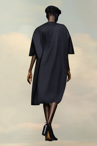Playing with the Maison's shadow house code for a framed effect, this knee-length oversized dress features short sleeves and a crew-neck. The back has a hidden zip and four white stitches showing the hand of the Maison: the opposite of a label. The model is 178cm tall. Model wears size 40.