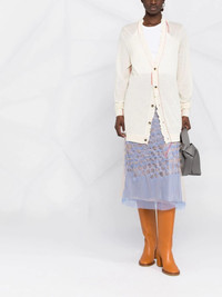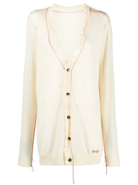 contrast-stitch logo-embroidered cardigan Designed with contrast topstitching, this semi-sheer Maison Margiela cardigan is presented in an off-white hue. Crafted in Italy from a blend of wool, silk and cotton; the relaxed silhouette features the brand's signature four-stitch moniker to the back of the neck. Made in Italy Composition Wool 91%, Silk 8%, Cotton 1% SIZE & FIT Model measurements Height 5 ft 10 in(1.77 m) Bust/Chest 32.28 in(82 cm) Hips 35.03 in(89 cm) Waist 25.19 in(64 cm) FittingInformation Designed to be unstructured, offering a loose fit throughout Made with a lightweight knit, this piece offers some stretch This piece fits true to size – take your usual size Washing instructions Dry Clean Only
