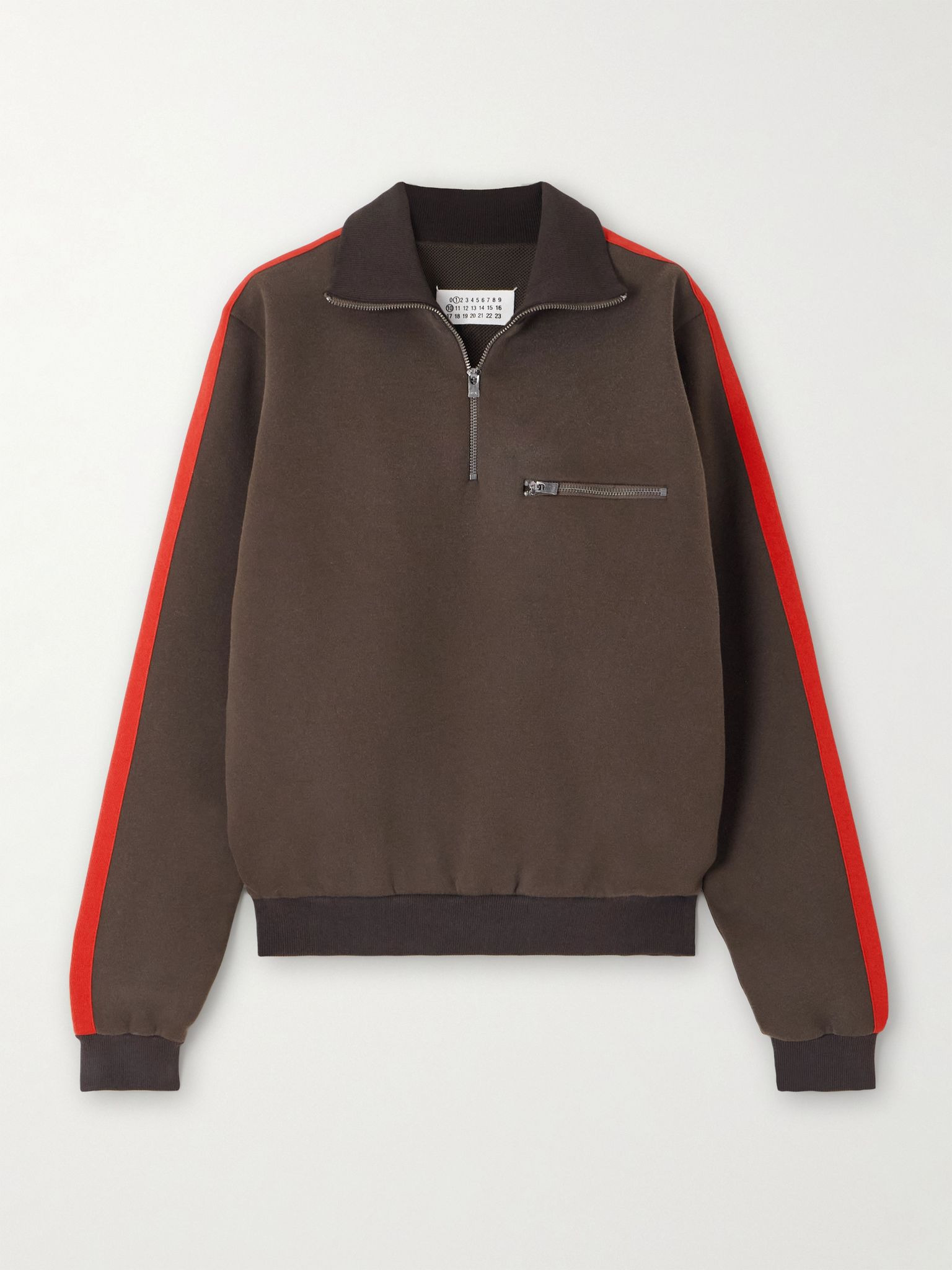 Maison Margiela's sweatshirt is made from cotton-blend jersey in a classic sporty style. Defined by ribbed trims, it has contrasting stripes along the arms and a half-zip neckline. Fans of the brand will also recognize the signature four stitches at the back. Size & Fit - Fits true to size, take your normal size - Cut for a slightly loose fit - Mid-weight, slightly stretchy fabric - Model is 177cm/ 5'10" and is wearing a size Small Model measurements: - Bust: 80cm/ 31.5" - Waist: 60cm/ 23.6" - Hip: 80cm/ 31.5" Details & Care - Brown and red cotton-blend jersey - Zip fastening along front - 58% cotton, 42% polyester; lining: 100% polyamide - Fully lined - Machine wash