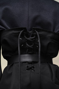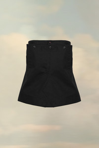 Crafted from cotton gabardine, this bodice top creates a distorted form with the M button and a lace-up feature on the back. It's finished with the four white stitches showing the hand of the Maison: the opposite of a label. The model is 178cm tall. Model wears size 40.