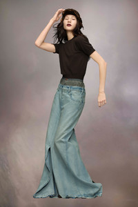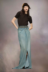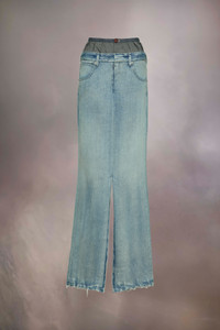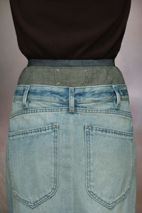 The Maison’s Anonymity of the lining concept is seen on the denim skirt with a dropped waistband revealing a pleated, buttoned front reminiscent of underwear. The skirt is cut to an extra-long silhouette with a large slit front and back – with distressed edges for a work-in-progress sentiment. Maison Margiela's signature, the four stitches, appear at the back; the opposite of a label. Product Details Item ID S51MI0006S30383961 Primary Fabric: 100% Cotton Secondary Fabric: 100% Cotton Pocket Lining: 65% Polyester 35% Cotton Cotton maxi skirt Wide contrasting waistband with belt loops Button closure Maison Margiela hook Front slit Slightly wider hem for added structure Side pockets Adjustable at the back Four stitches at the back Made in Italy Model is 178 cm tall and wears a size 40.