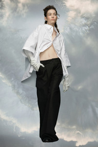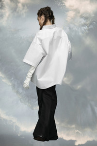 The short-sleeve shirt in cotton poplin is reworked in an oversized fit featuring pleated details at the waist, contrasting a minimal back. Maison Margiela’s signature Four stitches appear at the back; the opposite of a label. Product Details Item ID S29DL0217M35014100 Composition: 100% cotton Cotton poplin shirt Pointed collar Dropped shoulder Short sleeves Front pleats Mother of pearl button closure Raw-edge hem Curved hem Four stitches at the back Oversized Made in Italy