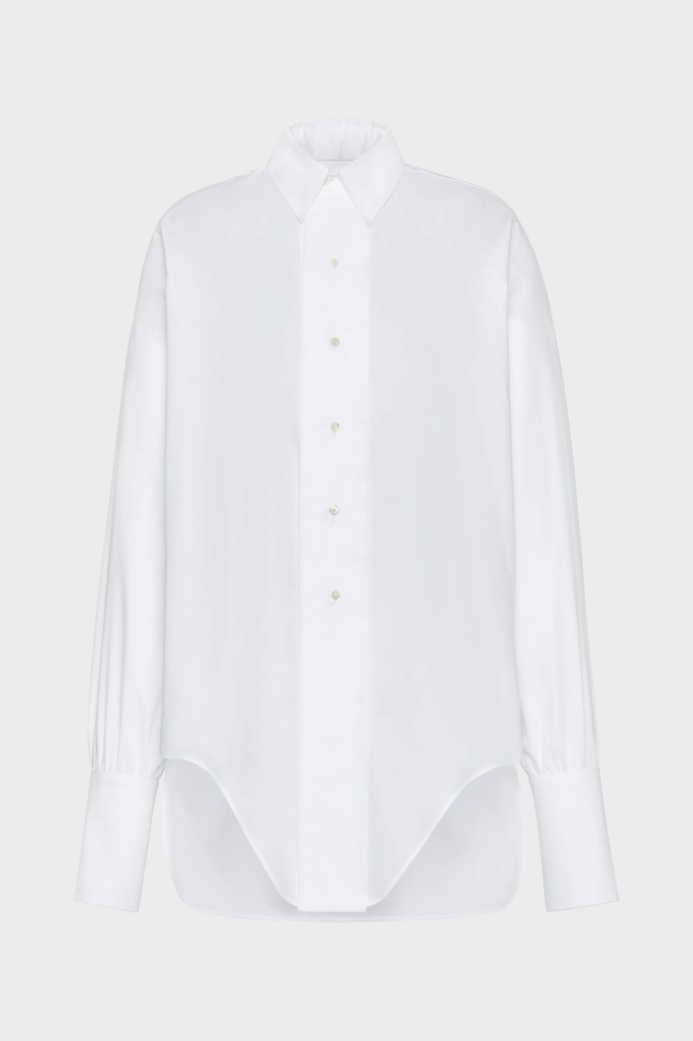 This cotton shirt plays with proportion, cutting a clean silhouette from classic elements: sharp collar, oversized cuffs, and a curved hem. Familiar components, restructured. At the back, the Maison’s signature four stitches appear; the opposite of a label. Product Details Item ID S29DT0006M35308100 Primary Fabric: 100% Cotton Long-sleeved cotton shirt Pointed collar Front button fastening Oversized cuffs with button closure Curved, pointed front hem Straight back hem Made in Italy