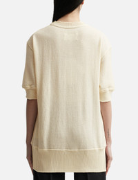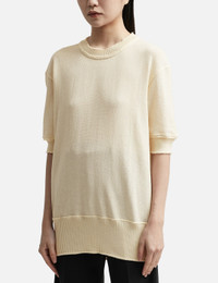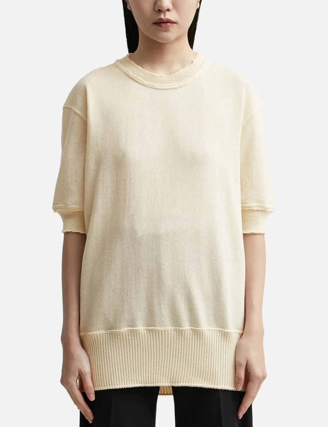 - Maison Margiela - Crewneck Sweater - Short sleeves - Ribbed crewneck, cuffs, and hem - Dropped shoulders - Exposed seams - Raw edges - Signature 4 stitch moniker at rear yoke - Extended straight hem - Color: Off White - Material: 62% Wool, 26% Acrylic, 12% Polyamide - See more Knitwear and Clothing SIZING - Model wears size S - Model measures: Height 170cm, Chest 29”/75cm, Waist 22”/57cm, Hip 33”/86cm