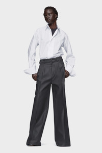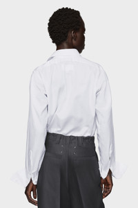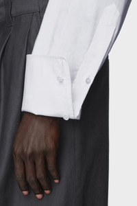 This cotton shirt plays with proportion, cutting a clean silhouette from classic elements: sharp collar, oversized cuffs, and a curved hem. Familiar components, restructured. At the back, the Maison’s signature four stitches appear; the opposite of a label. Product Details Item ID S29DT0006M35308100 Primary Fabric: 100% Cotton Long-sleeved cotton shirt Pointed collar Front button fastening Oversized cuffs with button closure Curved, pointed front hem Straight back hem Made in Italy