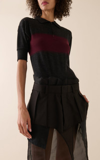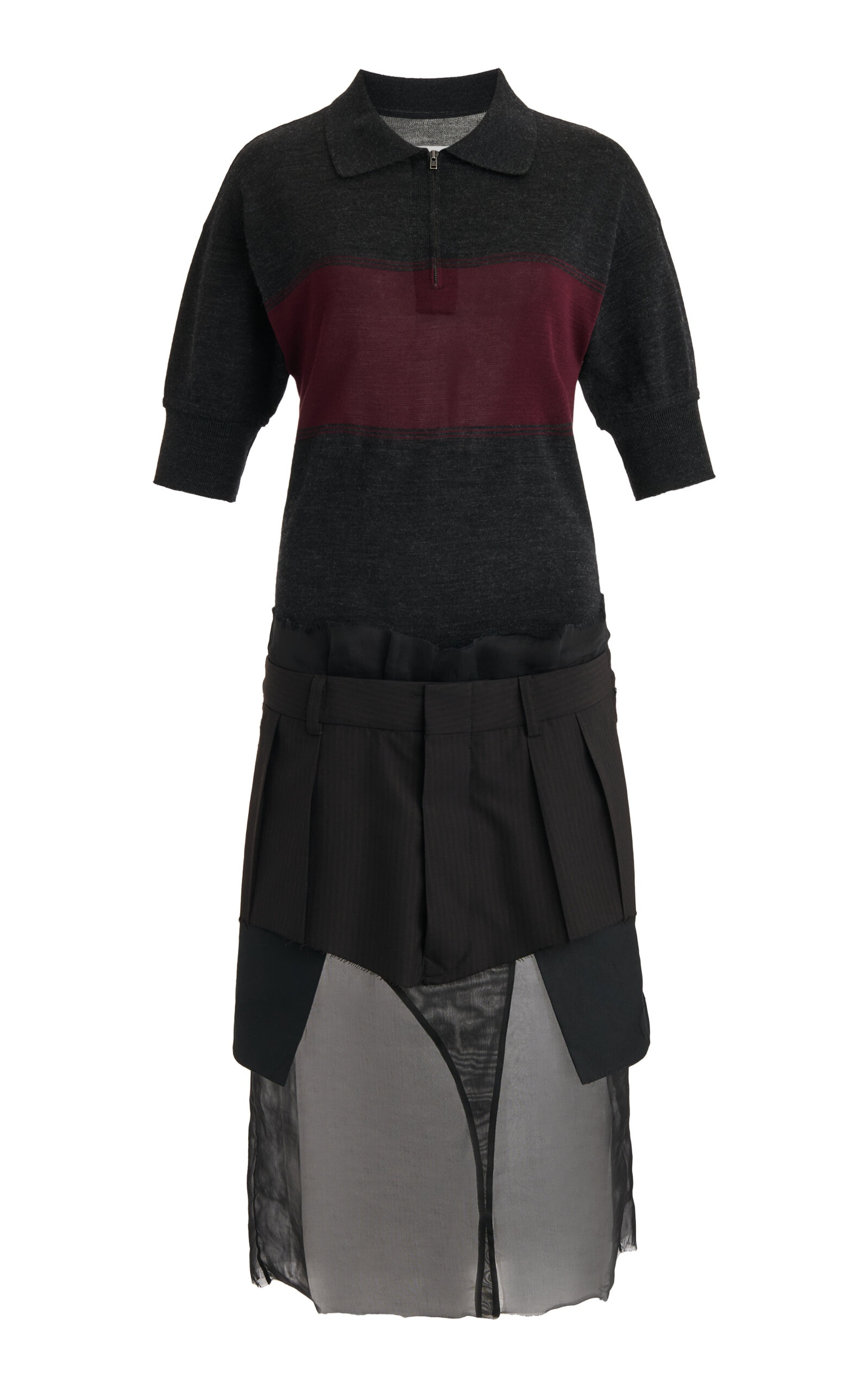 Season after season, Creative Director John Galliano pays homage to archival signatures of the French house, seamlessly updated with trompe l'oeil flourishes and ultra-cool tailoring. This deconstructed midi dress features a knit-wool polo bodice, pleated suiting waist, and distressed silk chiffon underlay. PRODUCT DETAILS - Pre-Fall '24 - Zip fastening - Composition: 100% Virgin Wool; 100% Silk; 72% Wool, 18% Polyamide-Nylon, 10% Cotton; Pocket Lining: 100% Cotton; Application: 72% Wool, 18% Polyamide-Nylon, 10% Cotton - Dry clean - Imported SIZE & FIT - Our model is wearing a size IT 38 - Model is 5'11" with a 31.5" bust, 23" waist, and 34.5" hip - Designed for a relaxed fit