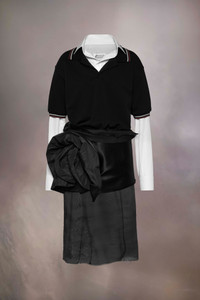 Experimenting with the Maison's concept of dressing in haste, the midi dress comprises of a cotton poplin collar and sleeves, polo shirt in cotton piquet and a silk blend mini skirt with Décortiqué midi panel. It features destroyed details contrasted by the elegant, voluminous ruffle to the side. Maison Margiela's signature, the Four stitches, appear at the back; the opposite of a label. Product Details Item ID S51DD0022MTN019900 Primary fabric: 100% cotton Secondary fabric: 50% silk, 50% cotton Mix fabric midi dress Cotton poplin collar and long sleeves Buttoned cuffs Cotton pique polo T-shirt Silk blend skirt Décortiqué details Side ruffle Four stitches at the back Made in Italy Model is 5'8" tall and wears a size 40.