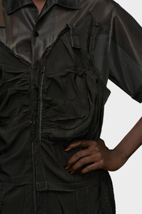 The dress is cut at the knee and plays with the Maison’s Decortique technique revealing the construction of the garment, while creating a new silhouette with sheer pannelling. The dress has short sleeves and buttons, with a layered aesthetic and side slits that reveal the Anonymity of the lining design code. Maison Margiela's signature, the four stitches, appear at the back; the opposite of a label. Product Details Item ID S51DD0027MTJ020900 Primary Fabric: 100% Polyester Secondary Fabric: 100% Viscose-Rayon Polyester viscose midi dress Pointed collar Short sleeves Button closure Decortique details Four stitches at the back Made in Italy Model is 178 cm tall and wears a size 40.
