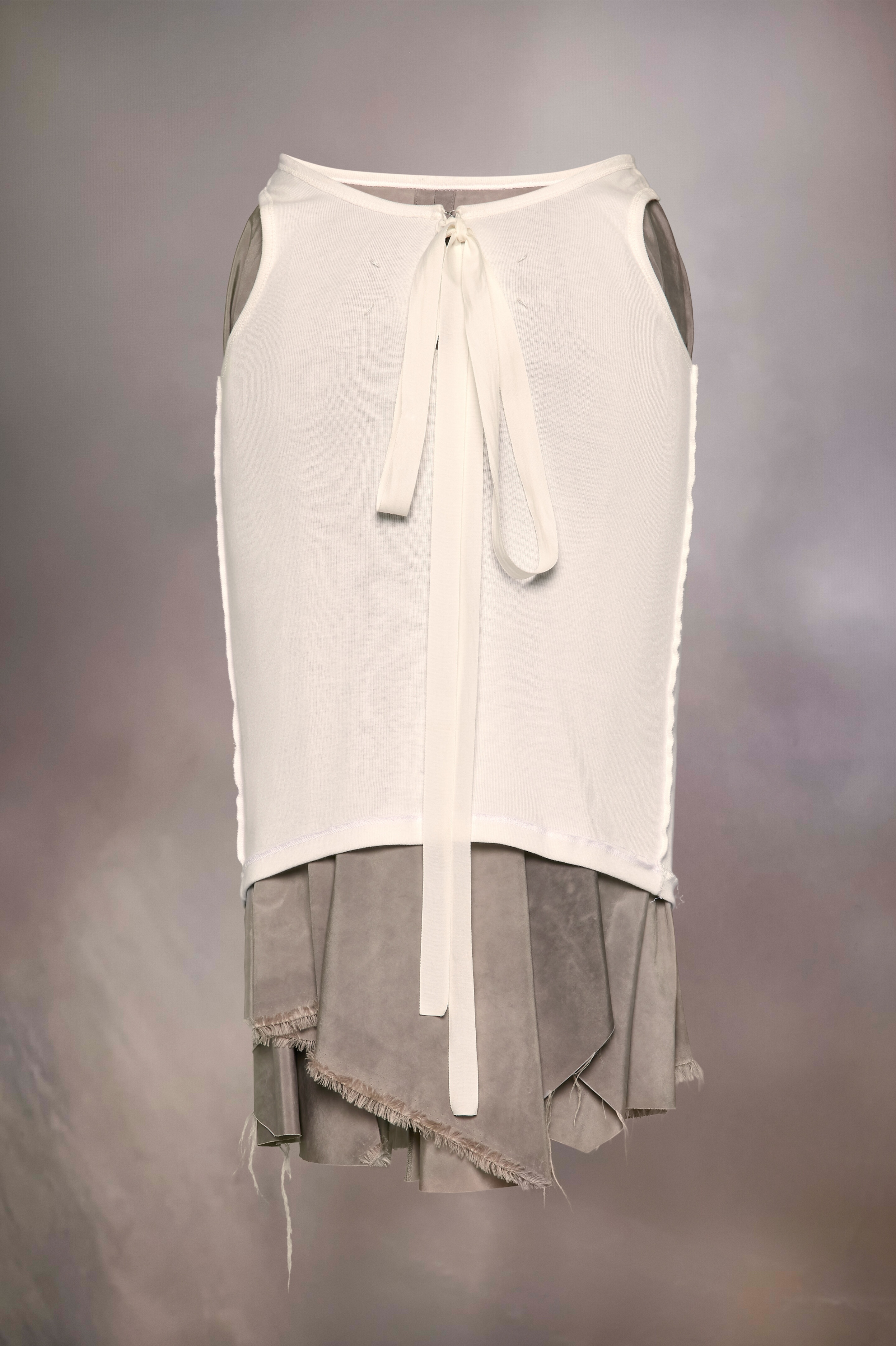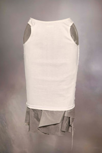 Lending the impression of a tank top turned inside out and pushed down, the skirt becomes a new silhouette with Decortique hip cut-outs and a long ribbon tie at the back. The contrast under layer is seemingly trapped, creating folds and an asymmetric hemline via the tighter upper layer. It features raw edges and fraying to further the work-in-progress impact. Product Details Item ID S51ME0033MTN062816 Primary Fabric: 100% Polyester Secondary Fabric: 100% Cotton midi skirt Double-layer design Contrasting pockets Asymmetrical Raw-edge hem Zip and hook closure at the back Four stitches at the back Made in Italy