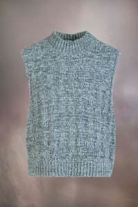 The sleeveless crew-neck knit vest comes in denim bouclé with ribbed trims for a textured finish and demonstrates the Maison's off-kilter approach to knitwear. Gauge 3.
