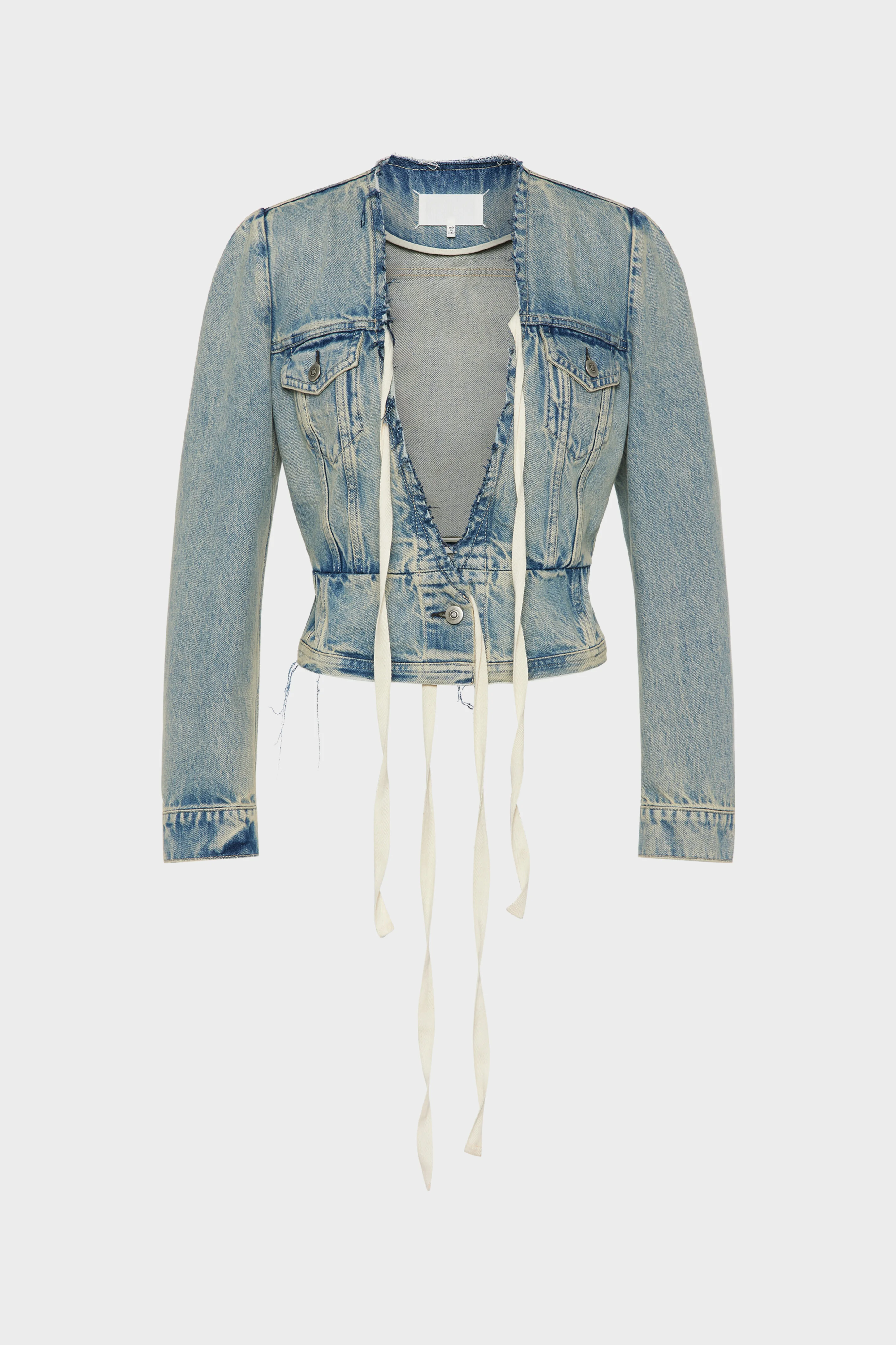 This jacket is crafted in denim with a deep V-cut front and a button-up front fastening. The neckline draws on our archival pieces, where the collar is cut away to form a raw-edged V. The design maintains a clean, straight silhouette detailed with buttoned chest pockets, side pockets, and a front button closure.The front ties are a reference to the blouse blanche- the white lab coats worn by our team. At the back, the Maison’s signature four stitches appear; the opposite of a label. Product Details Item ID S29AM0412M30066962 Primary fabric: 100% cotton Long sleeves Deep v-neck Tie closure at the front Four stitches at the back Made in Italy