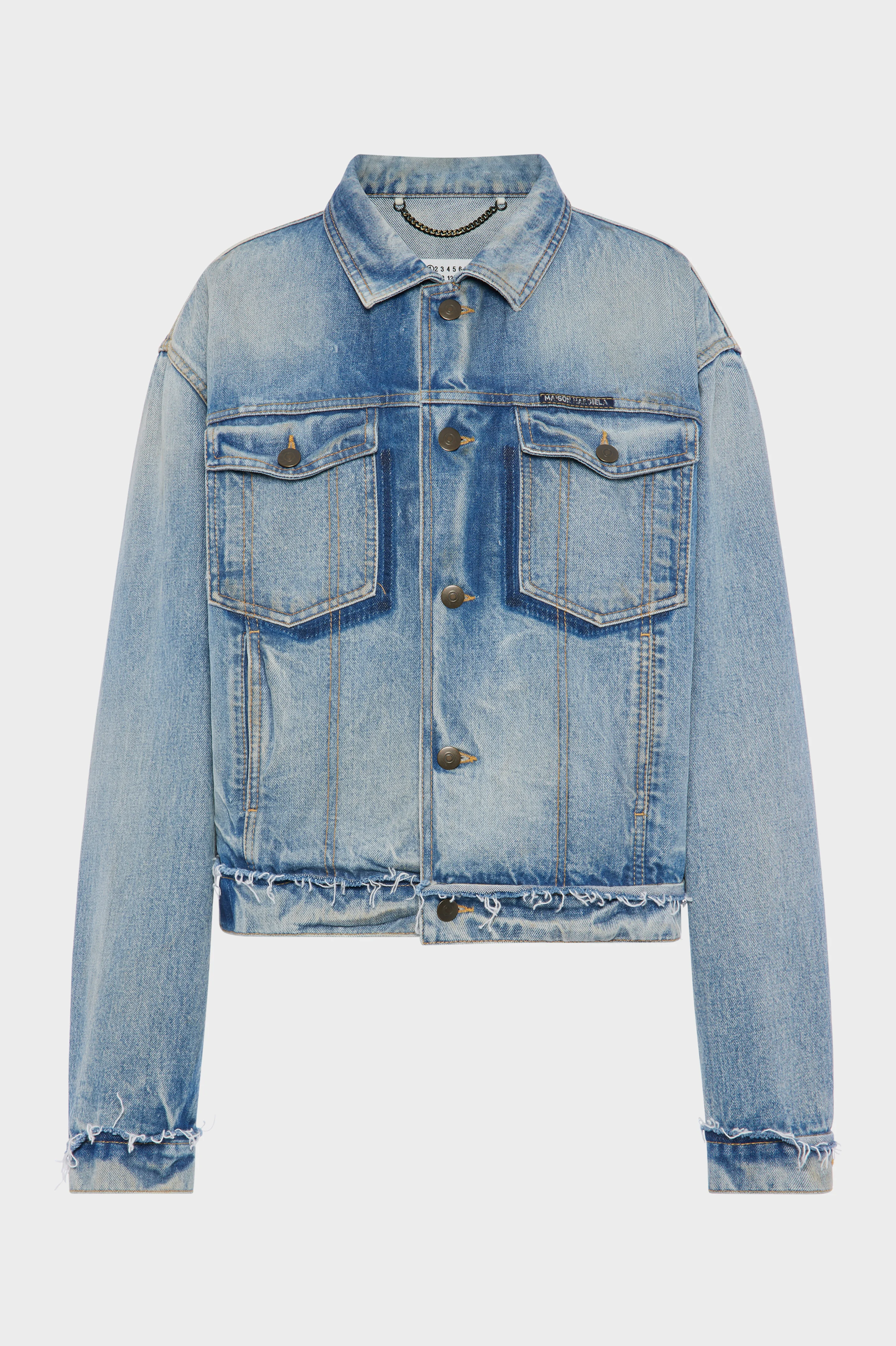 Cut from washed cotton denim, this jacket reflects the Maison’s exploration of lived-in garments. Subtle fading, frayed hems and softened seams create a patina of wear, while metal button fastenings, flap chest pockets and a subtle, vintage-inspired Maison Margiela label detail nod to archetypal denim design. At the back, the Maison’s signature four stitches appear; the opposite of a label. Product Details Item ID S51AM0517S30561987 Primary fabric: 100% cotton 14 oz origin denim Distressed and raw-cut hem detailing Long sleeves Shirt collar neckline Front button closure Four stitches at the back Made in Italy