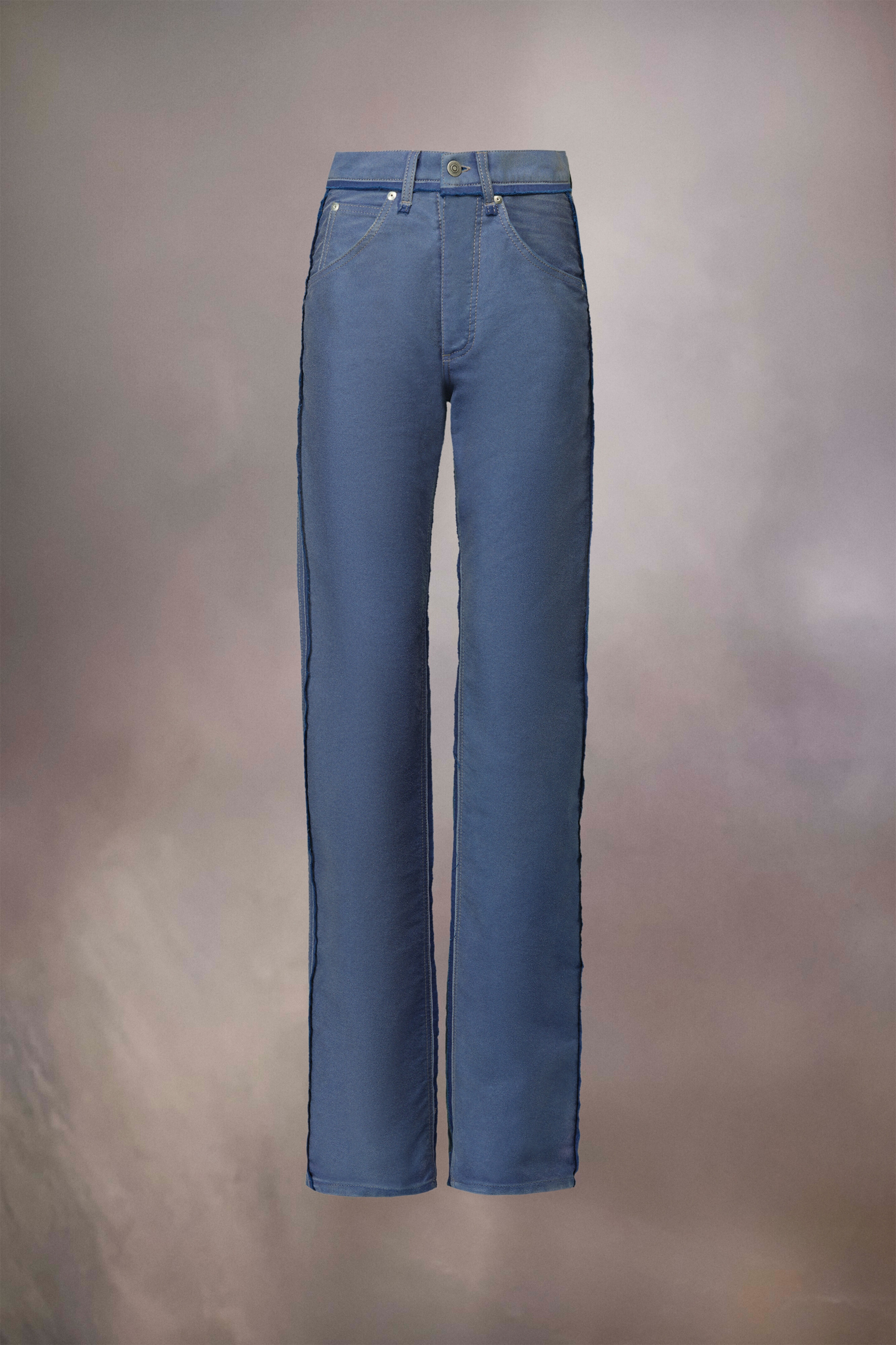 In worker's moleskin with distressed edges, the straight-leg jeans feature classic five-pocket styling and belt loops. Maison Margiela's signature, the four stitches, appear at the back; the opposite of a label.