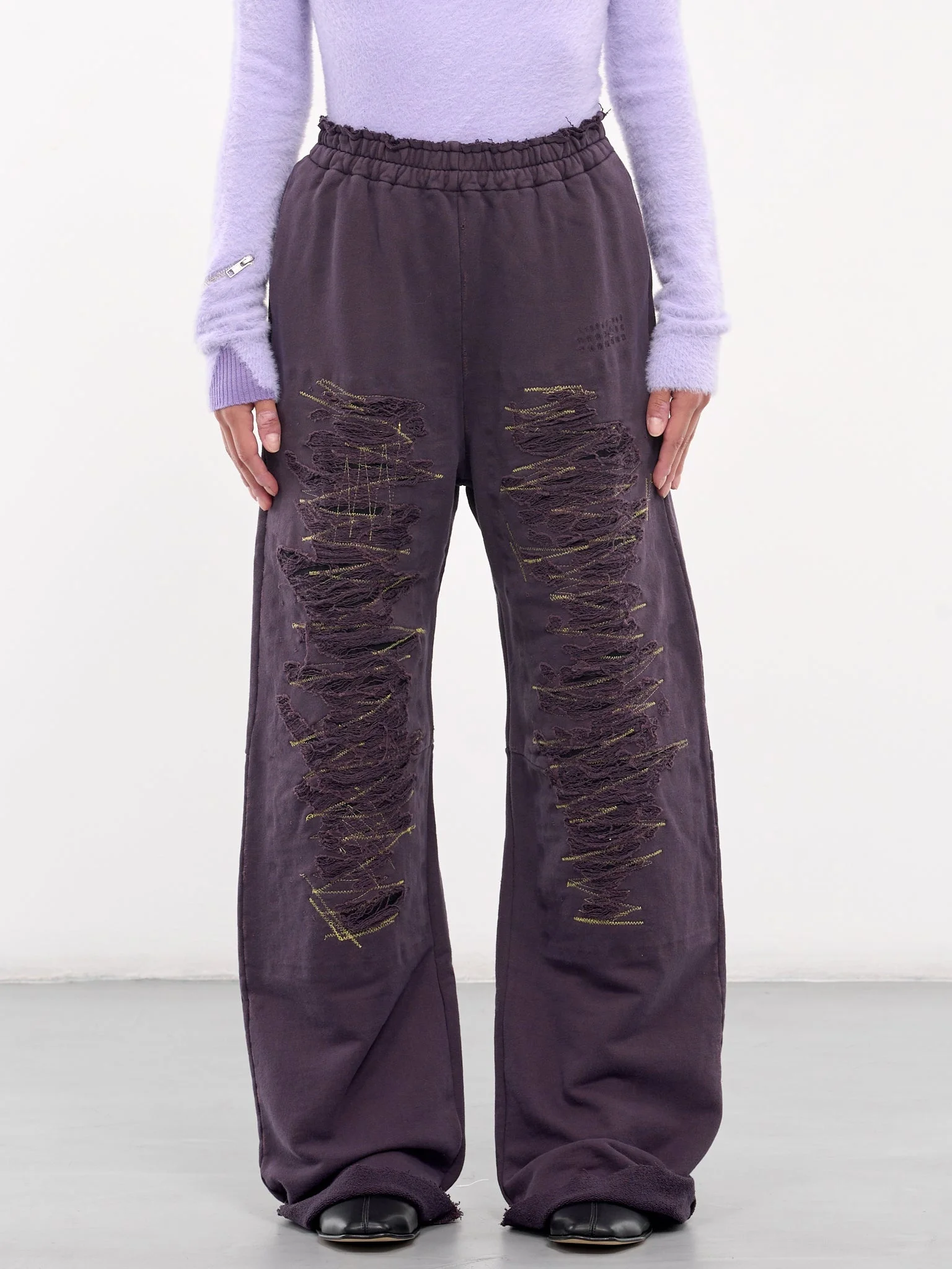 MM6 MAISON MARGIELA joggers in dark purple, paneled cotton construction, distressing throughout, elasticated waistband, raw hem, side pockets, back zip pocket & signature stitch, front heavy distressing & stitch repairing, wide leg, baggy fit. Made in Italy Standard Sizing Model is 5'6" wearing size S. Bust: 31" Waist: 24" Hips: 34"