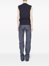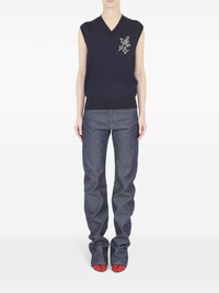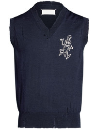 intarsia-knit wool vest With a knack for innovative design, Maison Margiela distresses this vest by adding holes and frayed details throughout. Knitted from wool in a dark blue colour, it is stitched with a carrot cartoon at the chest. Highlights - Dark blue - Wool - Fine knit - Distressed effect - Decorative stitching - V-neck - Sleeveless - Straight hem Imported Composition Wool 100% SIZE & FIT Model measurements Height 5 ft 10 in(1.77 m) Bust/Chest 32.67 in(83 cm) Hips 35.43 in(90 cm) Waist 23.62 in(60 cm) FittingInformation Designed to be unstructured, offering a loose fit throughout The ribbed hem offers a close, comfortable fit Made with a midweight knit, this piece offers some stretch This piece fits true to size – take your usual size Washing instructions Read Manufacturer Guidelines