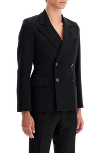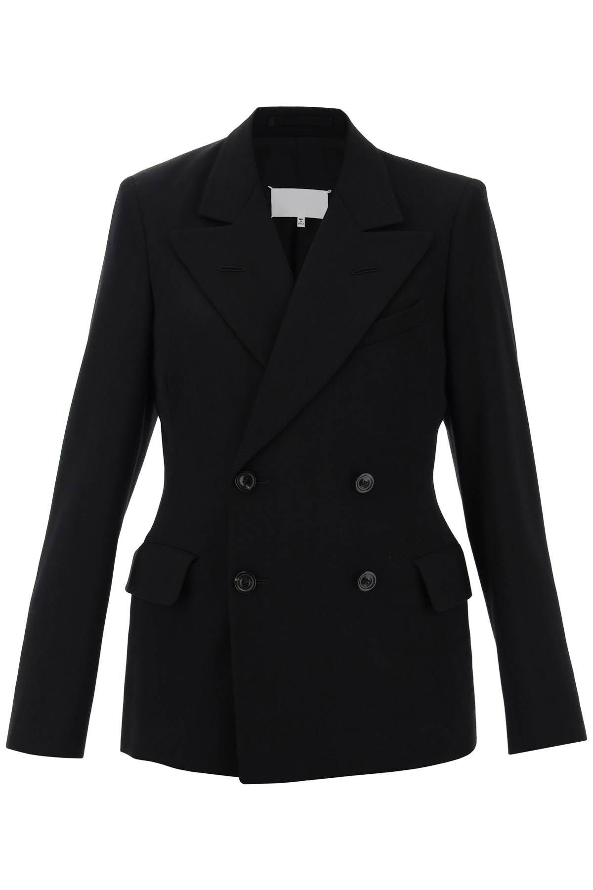 This Maison Margiela jacket, made of barathea wool, stands out for its slim-waisted design with a double-breasted closure and horn buttons. It features pointed lapels, front pockets with flaps, a chest pocket, and white stitching on the sleeve hem that distinguishes the garment, as well as the iconic Four-stitch moniker on the back of the collar. Lined with a blend of viscose and cotton with additional pockets. The model is 187 cm PRODUCT DETAILS Made In: Italy Composizione: 100% WO Supplier Color Code: BLACK Supplier Code: S67BN0041 M35032 FTA: No Season: SS24 Fastening Type: Bottoni, Nessuno