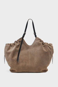 Crafted in supple suede, this oversized shopper merges volume with structure. The gathered top softens its angular form, while belt-inspired leather handles lend a utilitarian edge. A detachable pouch tucks inside, designed for everyday essentials. At the front, the Maison’s signature four stitches appear; the opposite of a label. Product Details Item ID SB2WC0007P8572HB072 Body: 100% Calf Leather Contrast: 100% Calf Leather Inside: 100% Calf Leather Inside: 100% Calf Leather Metallic Parts: 100% Brass, 100% Zama Accessories: 100% Polyester Metallic hardware Shopper bag in suede Gathered top construction Adjustable leather shoulder straps Removable internal flat pouch with printed logo Drawstring fastening Four stitches at the front Made in Italy