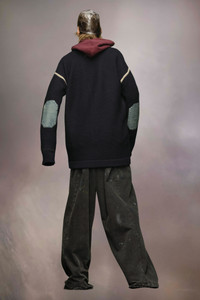 This V-neck knit cardigan features denim mending contrast elbow patches and frayed piping at the shoulders. Maison Margiela's signature, the four white stitches, appear at the back; the opposite of a label. Gauge 7. Product Details Item ID S50HA1081S18147511