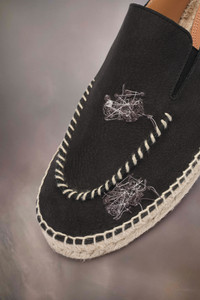 Featuring embroidery scribble on deer-effect nubuck leather, the slip-on espadrille mules have exposed stitching and a flatform sole.