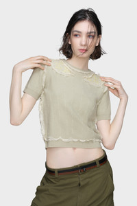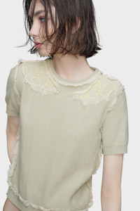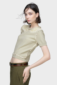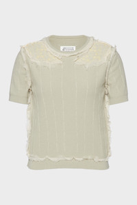 This short-sleeved knit contrasts distressed edging with applique panels that resemble the reverse side of embroidered fabric. Tonal stitch lines run vertically along the surface, echoing the inside of a garment. The result is a layered expression of refinement and deconstruction. Maison Margiela’s signature, the four stitches, appear at the back; the opposite of a label. Product Details Item ID S51HL0028M13153688 Primary Fabric: 100% Virgin Wool Secondary Fabric: 54% Acetate, 26% Polyamide-Nylon, 20% Silk Short-sleeve knit top with distressed lace overlays Deconstructed trims and exposed seams along sides and hem Fine vertical stitch lines run through the body Ribbed crewneck and cuffs Four stitches at the back Made in Italy