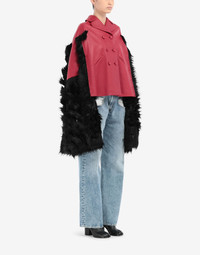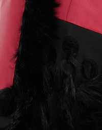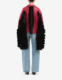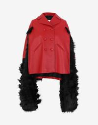 Double-breasted nappa leather cape with six tonal buttons, welt side pockets and contrast faux fur trim details at the sleeves and centre back – featuring the Maison's hole sequin technique to create a sequin effect. Taken from the Artisanal method of flat-pack cutting segmented with the contrast fabric. The proportion is inspired by children's clothing, exaggerated from miniaturized proportions. The back is accented with the white four-stitches moniker. Runway piece, look 19. Made in Italy. Item details 100% Ovine leather Faux fur Lapel collar Long sleeves Two pockets Button closing Fully lined