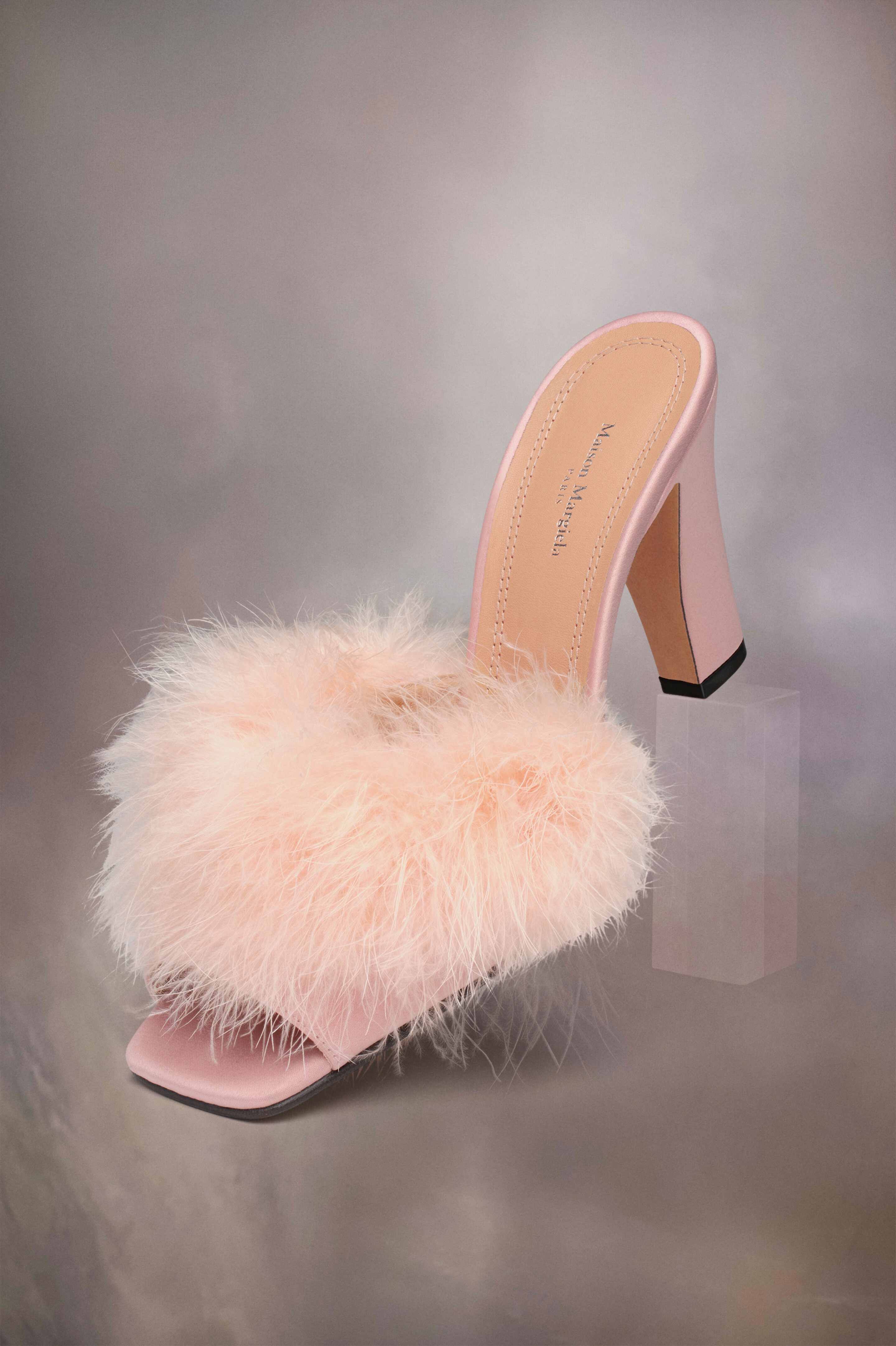 With a block heel, the mules feature statement feathers. The Maison Margiela logo appears on the inner sole and the numeric logo on the outer sole. Product Details Item ID S58WP0270P6229T4260 Upper: 71% cotton, 29% polyester Application: 100% turkey down Lining: 100% lamb leather Inside: 100% lamb leather Sole: 100% calf leather Contrast: 100% rubber Heel height: 9 cm/3,5 in Mules with feather application Made in Italy A digital certificate provided by the Aura Blockchain Consortium guarantees the authenticity of this product. Discover more on auraluxuryblockchain.com/#about