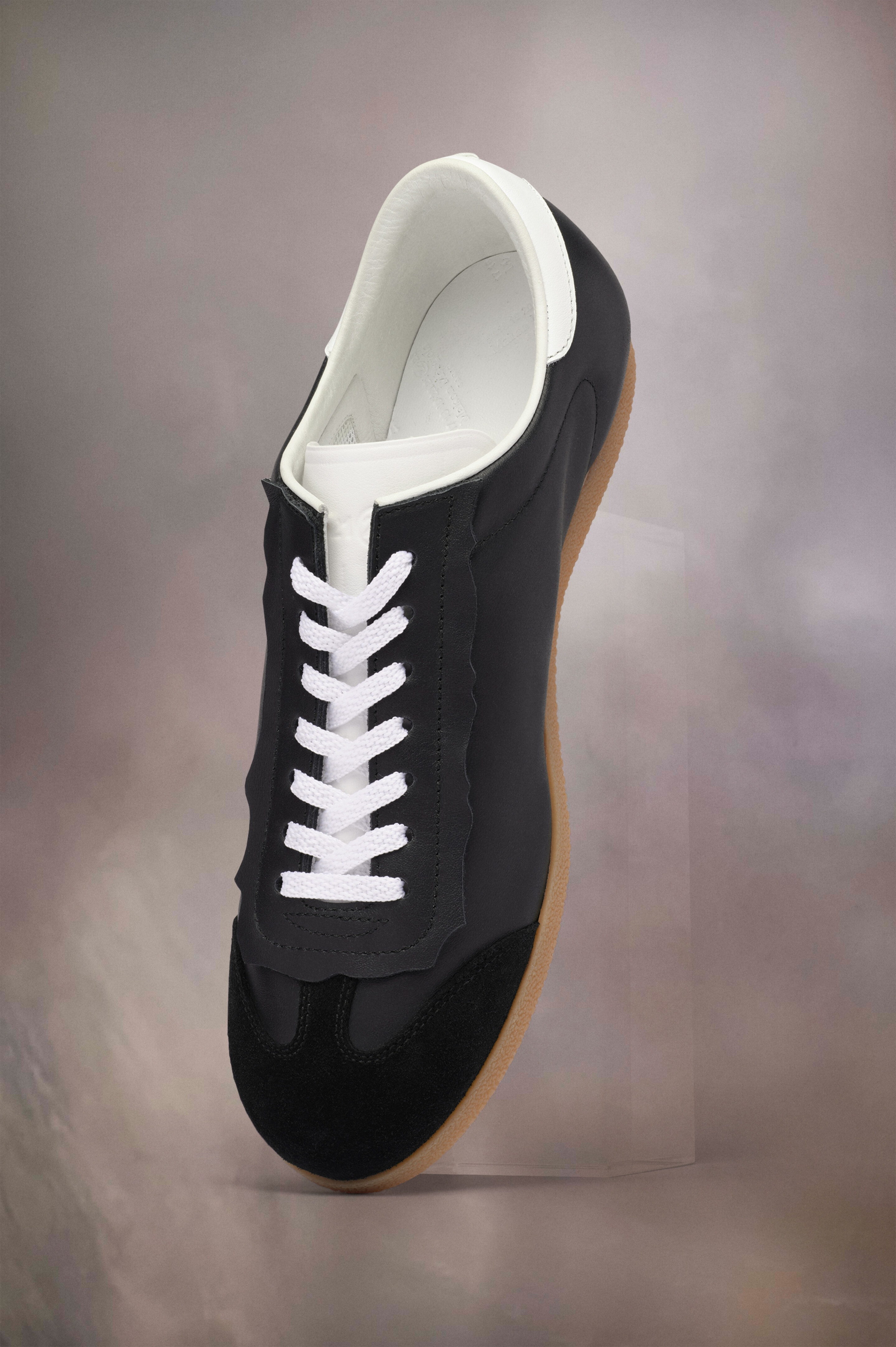In calfskin and suede, the Featherlight sneaker has a flat sole and contrast tongue and heel. The back features a single white stitch showing the hand of Maison Margiela.