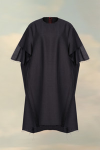 The knee-length dress comes in dry mohair for a slightly sheer finish. It has an undone aesthetic with raw edges and unfinished short sleeves.