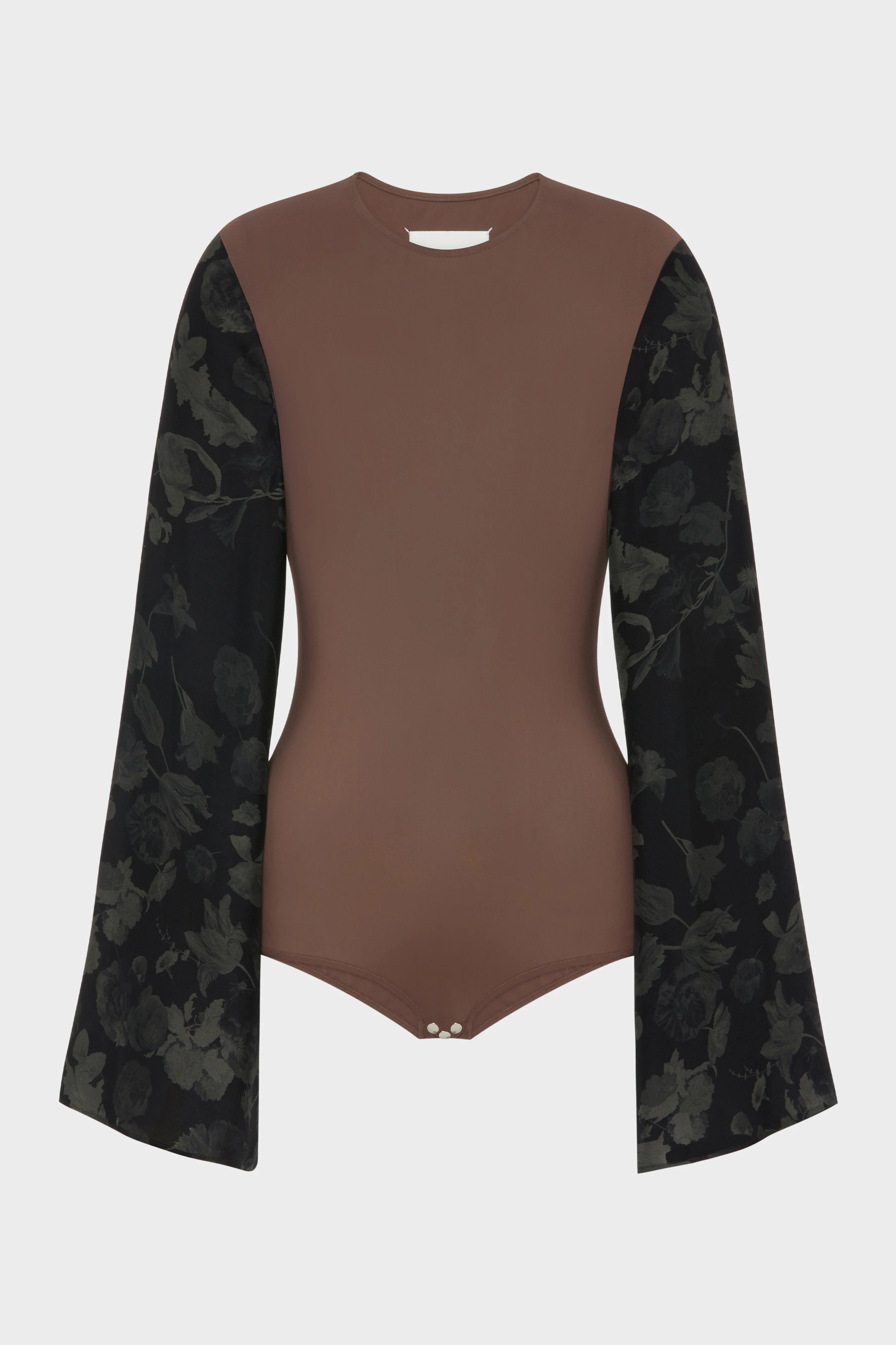 A refined study in contrast, this bodysuit pairs a smooth, streamlined torso with sheer sleeves patterned in fragmented floral imagery. Drawn from the still life compositions of Dutch masters, the print feels gently worn and atmospheric. At the back, the Maison’s signature four stitches appear; the opposite of a label. Product Details Item ID S29NA0174M20039140 Primary fabric: 75% polyamide-nylon 25% elastane-spandex Secondary fabric: 100% silk Long flared sleeves in floral pattern Round neck Four stitches at the back Made in Italy